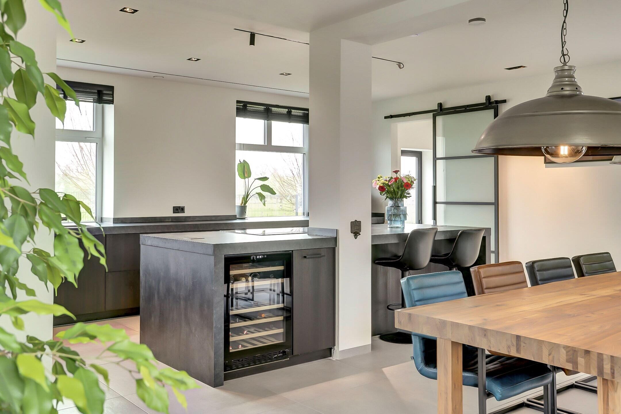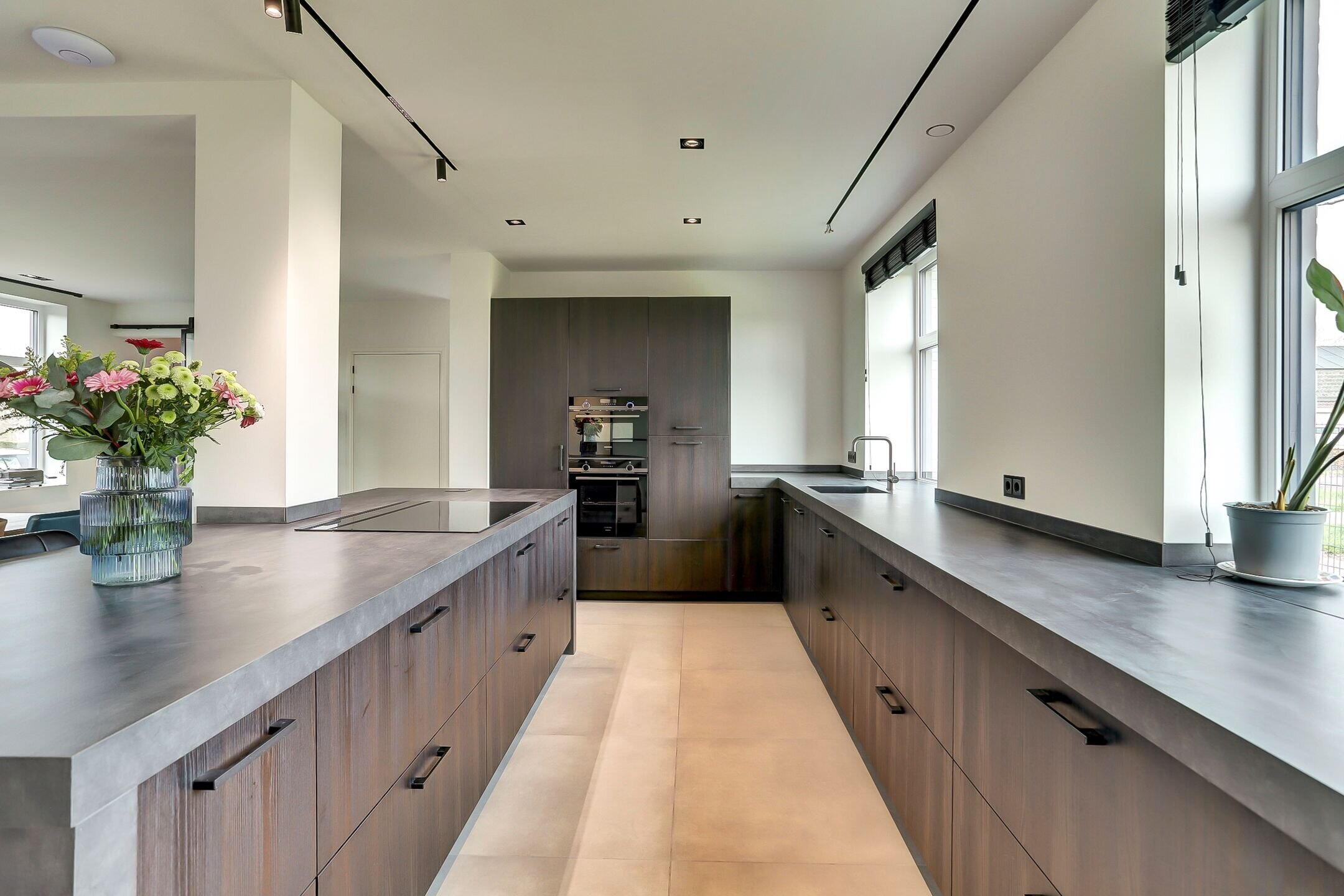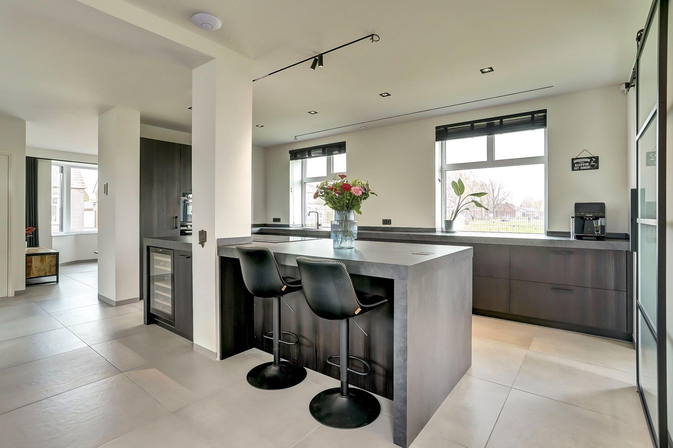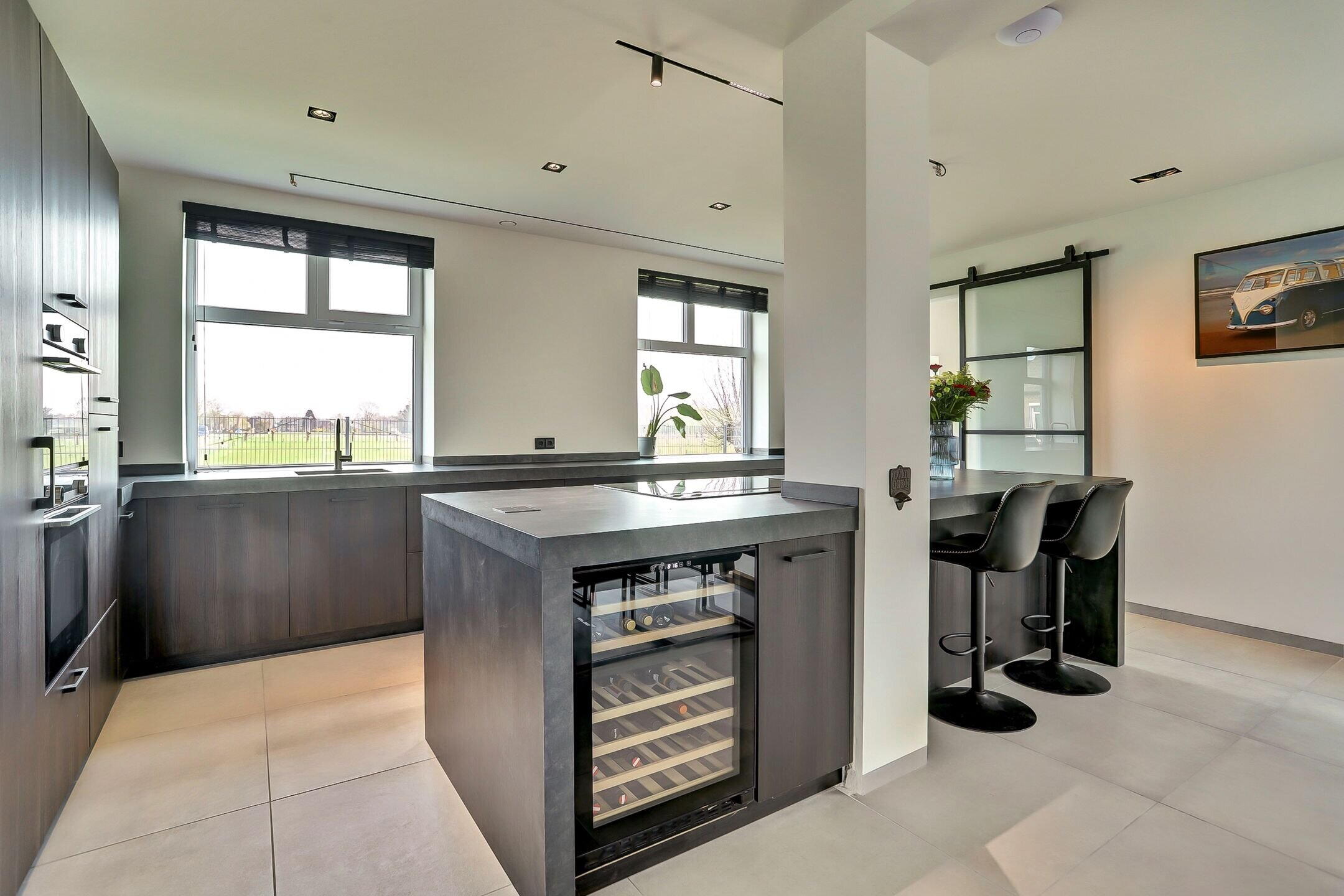 Via een elegante schuifdeur van melkglas loop je door naar het hart van de woning: de leefruimte waarin keuken en woonkamer naadloos in elkaar overlopen. De keuken is zonder twijfel een plek waar je wilt zijn. Een echte leefkeuken, ontworpen voor zowel koken als samenzijn. Het vijfpits inductiefornuis met geïntegreerde afzuiging en een slimme, automatisch omhoogkomende spatplaat maakt koken hier niet alleen praktisch maar ook een beleving. De twee ovens (waarvan één combi), de op hoogte geplaatste vaatwasser en de extra grote koelkast zorgen voor optimaal gebruiksgemak. In de vele donkere kasten en lades met houtmotief is er volop ruimte voor al je keukengerei en voorraad, terwijl de klimaatkast een luxe extra vormt voor de liefhebber. Het aanrechtblad is van kunststof dus makkelijk schoon te maken en te onderhouden. Dankzij ramen aan twee zijden en een grote lichtstraat boven het zitgedeelte baadt de keuken in het daglicht. Het is een plek waar je moeiteloos uren doorbrengt of je nu staat te koken, gezellig aan de bar zit of uitgebreid dineert aan de eettafel waar met gemak familie en vrienden kunnen aanschuiven.