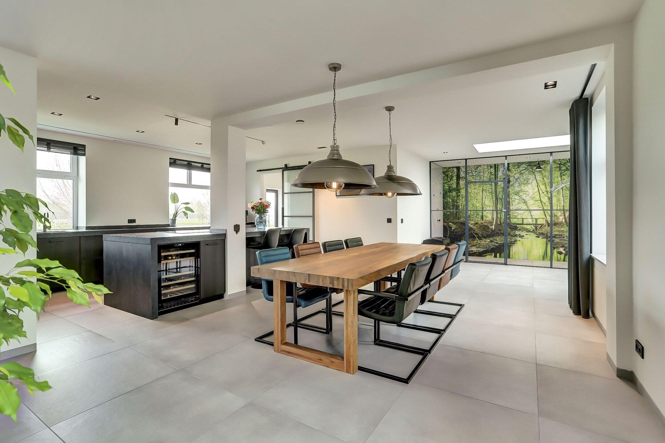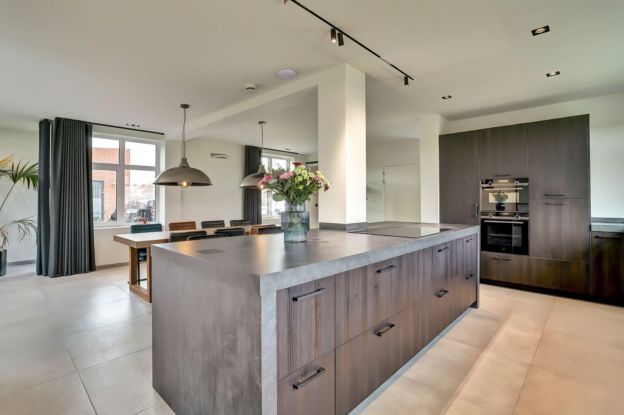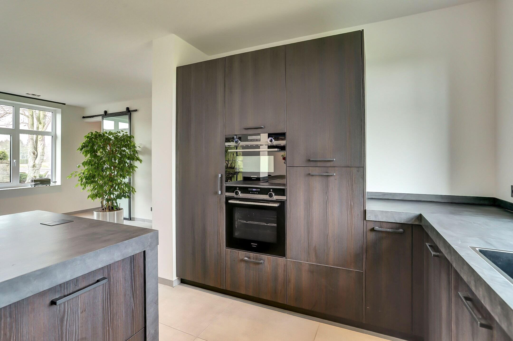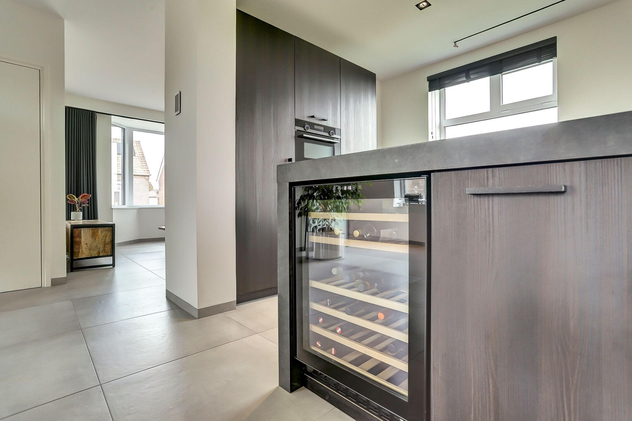 Via een elegante schuifdeur van melkglas loop je door naar het hart van de woning: de leefruimte waarin keuken en woonkamer naadloos in elkaar overlopen. De keuken is zonder twijfel een plek waar je wilt zijn. Een echte leefkeuken, ontworpen voor zowel koken als samenzijn. Het vijfpits inductiefornuis met geïntegreerde afzuiging en een slimme, automatisch omhoogkomende spatplaat maakt koken hier niet alleen praktisch maar ook een beleving. De twee ovens (waarvan één combi), de op hoogte geplaatste vaatwasser en de extra grote koelkast zorgen voor optimaal gebruiksgemak. In de vele donkere kasten en lades met houtmotief is er volop ruimte voor al je keukengerei en voorraad, terwijl de klimaatkast een luxe extra vormt voor de liefhebber. Het aanrechtblad is van kunststof dus makkelijk schoon te maken en te onderhouden. Dankzij ramen aan twee zijden en een grote lichtstraat boven het zitgedeelte baadt de keuken in het daglicht. Het is een plek waar je moeiteloos uren doorbrengt of je nu staat te koken, gezellig aan de bar zit of uitgebreid dineert aan de eettafel waar met gemak familie en vrienden kunnen aanschuiven.