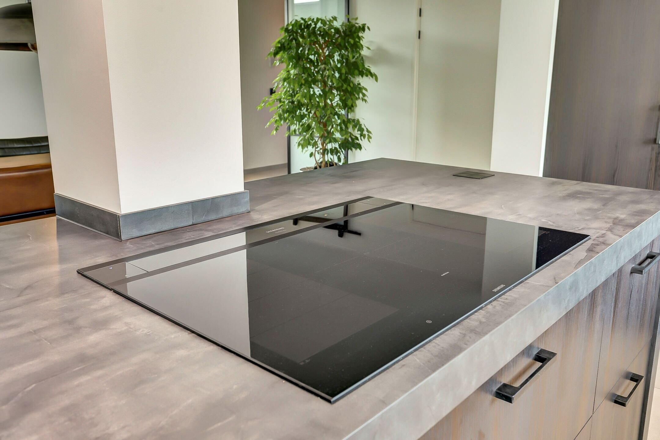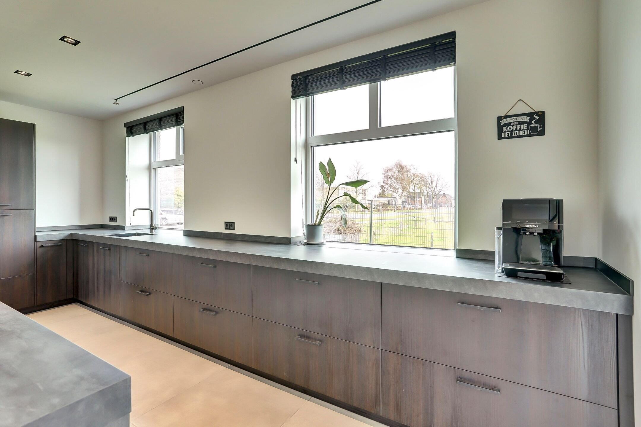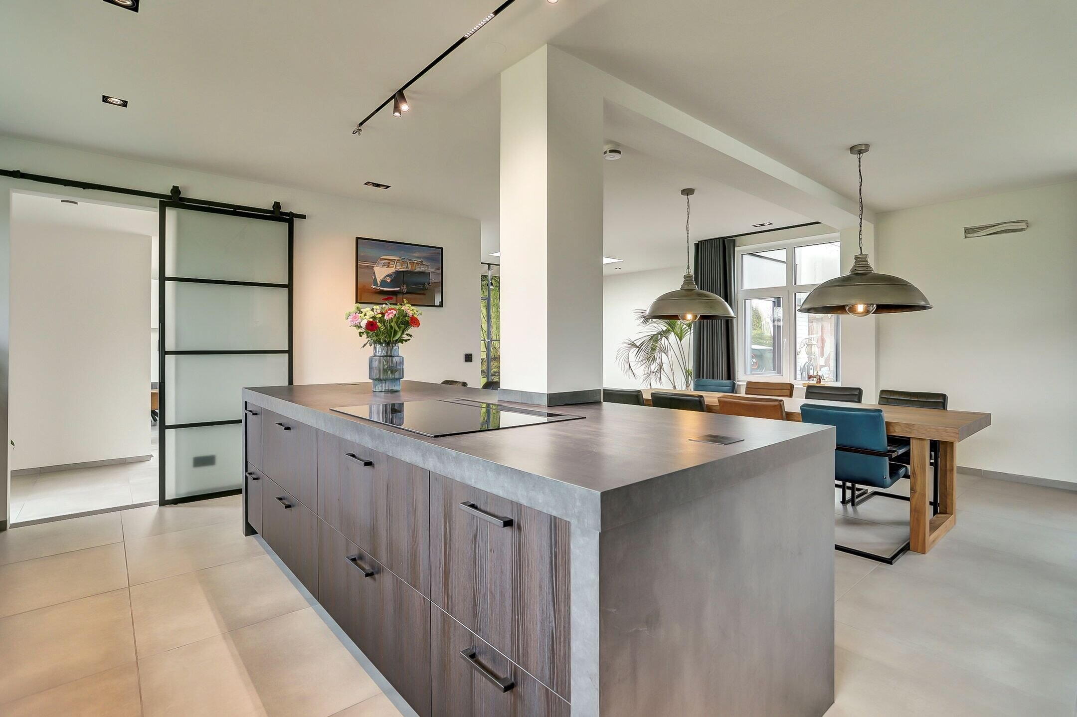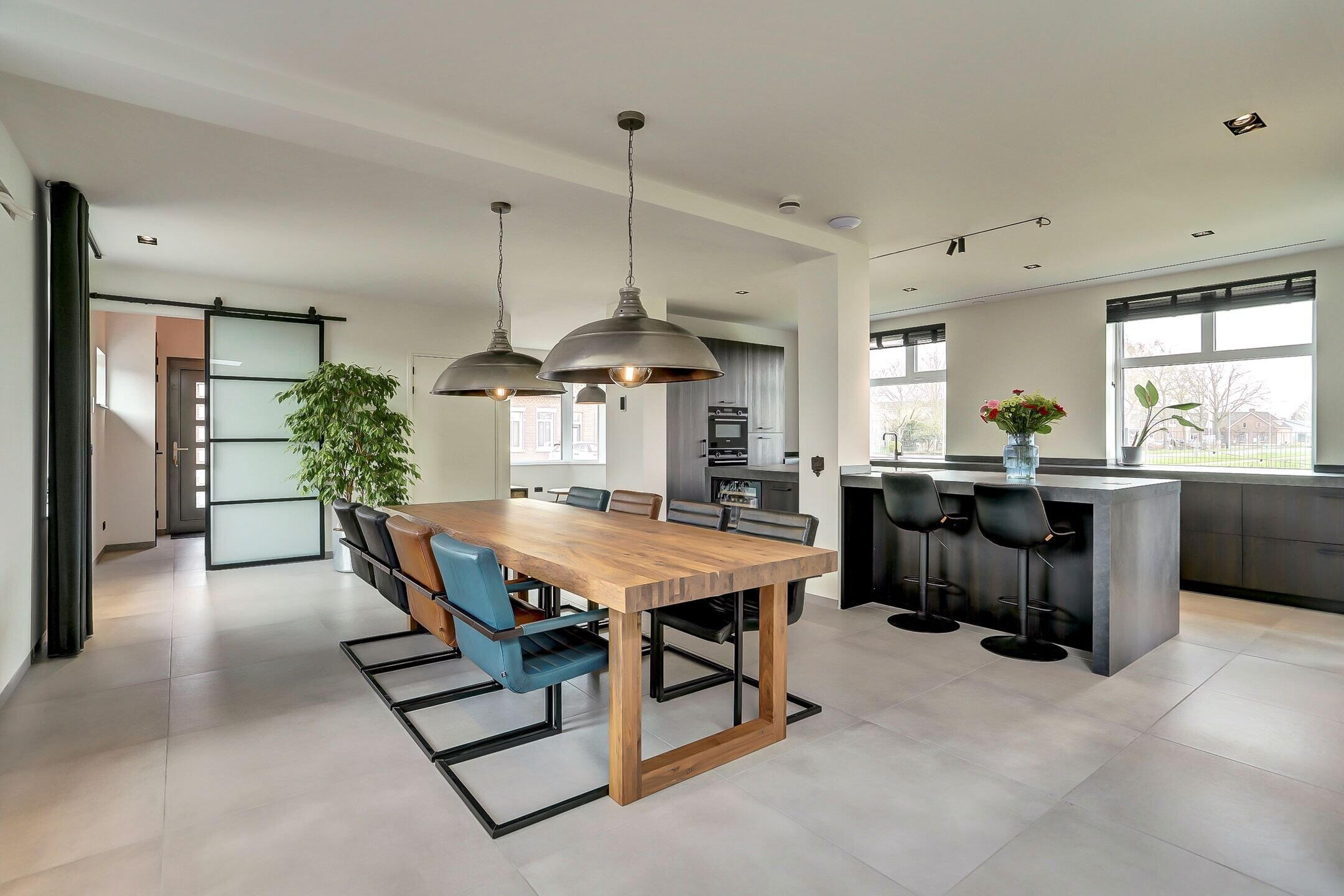 Via een elegante schuifdeur van melkglas loop je door naar het hart van de woning: de leefruimte waarin keuken en woonkamer naadloos in elkaar overlopen. De keuken is zonder twijfel een plek waar je wilt zijn. Een echte leefkeuken, ontworpen voor zowel koken als samenzijn. Het vijfpits inductiefornuis met geïntegreerde afzuiging en een slimme, automatisch omhoogkomende spatplaat maakt koken hier niet alleen praktisch maar ook een beleving. De twee ovens (waarvan één combi), de op hoogte geplaatste vaatwasser en de extra grote koelkast zorgen voor optimaal gebruiksgemak. In de vele donkere kasten en lades met houtmotief is er volop ruimte voor al je keukengerei en voorraad, terwijl de klimaatkast een luxe extra vormt voor de liefhebber. Het aanrechtblad is van kunststof dus makkelijk schoon te maken en te onderhouden. Dankzij ramen aan twee zijden en een grote lichtstraat boven het zitgedeelte baadt de keuken in het daglicht. Het is een plek waar je moeiteloos uren doorbrengt of je nu staat te koken, gezellig aan de bar zit of uitgebreid dineert aan de eettafel waar met gemak familie en vrienden kunnen aanschuiven.