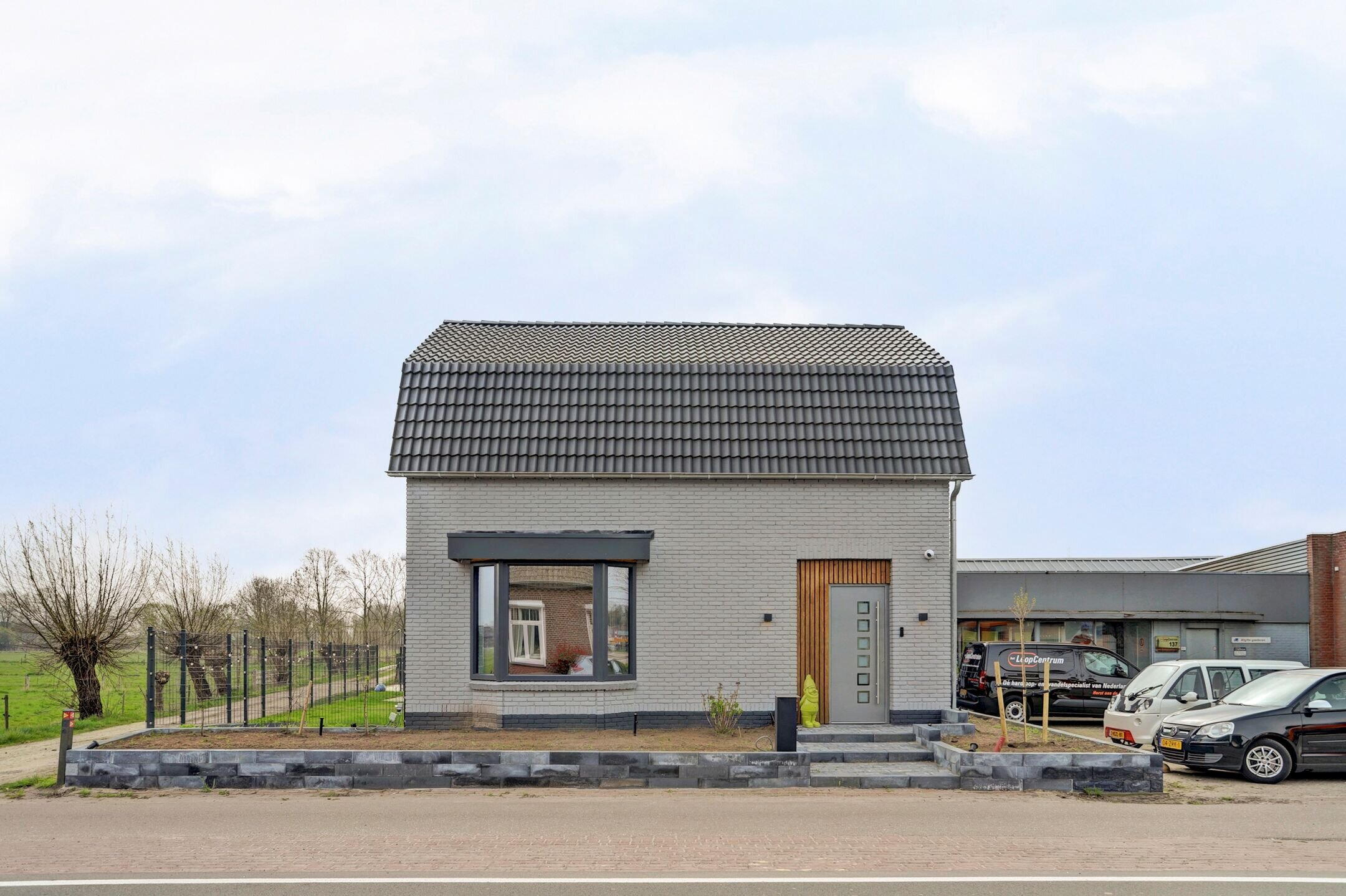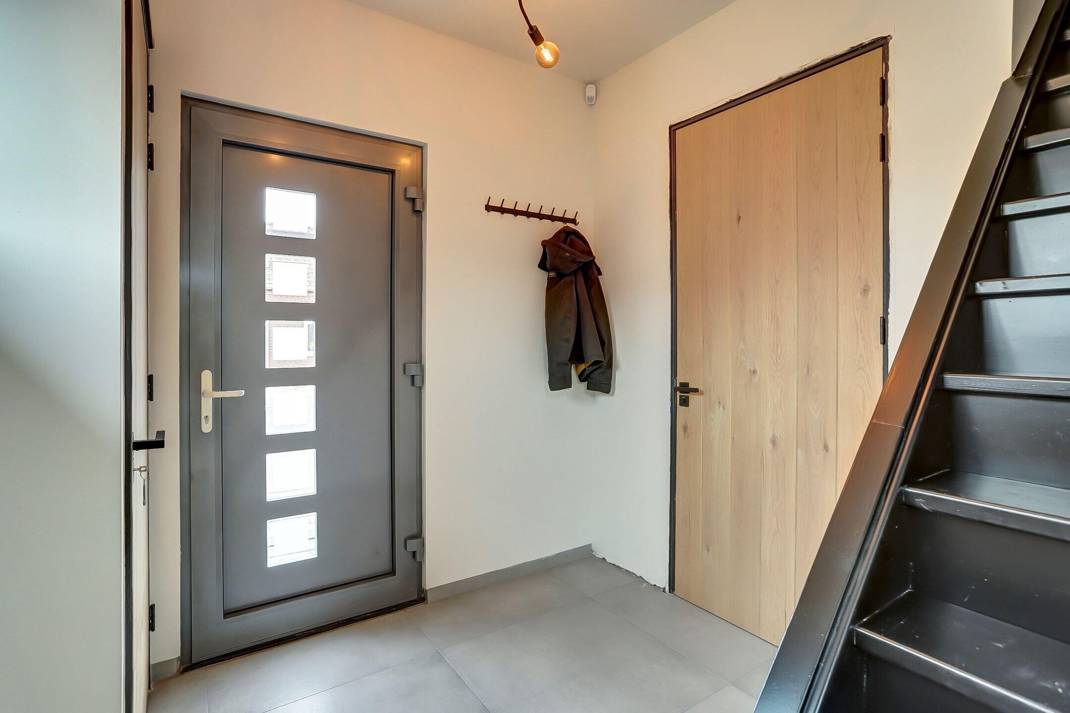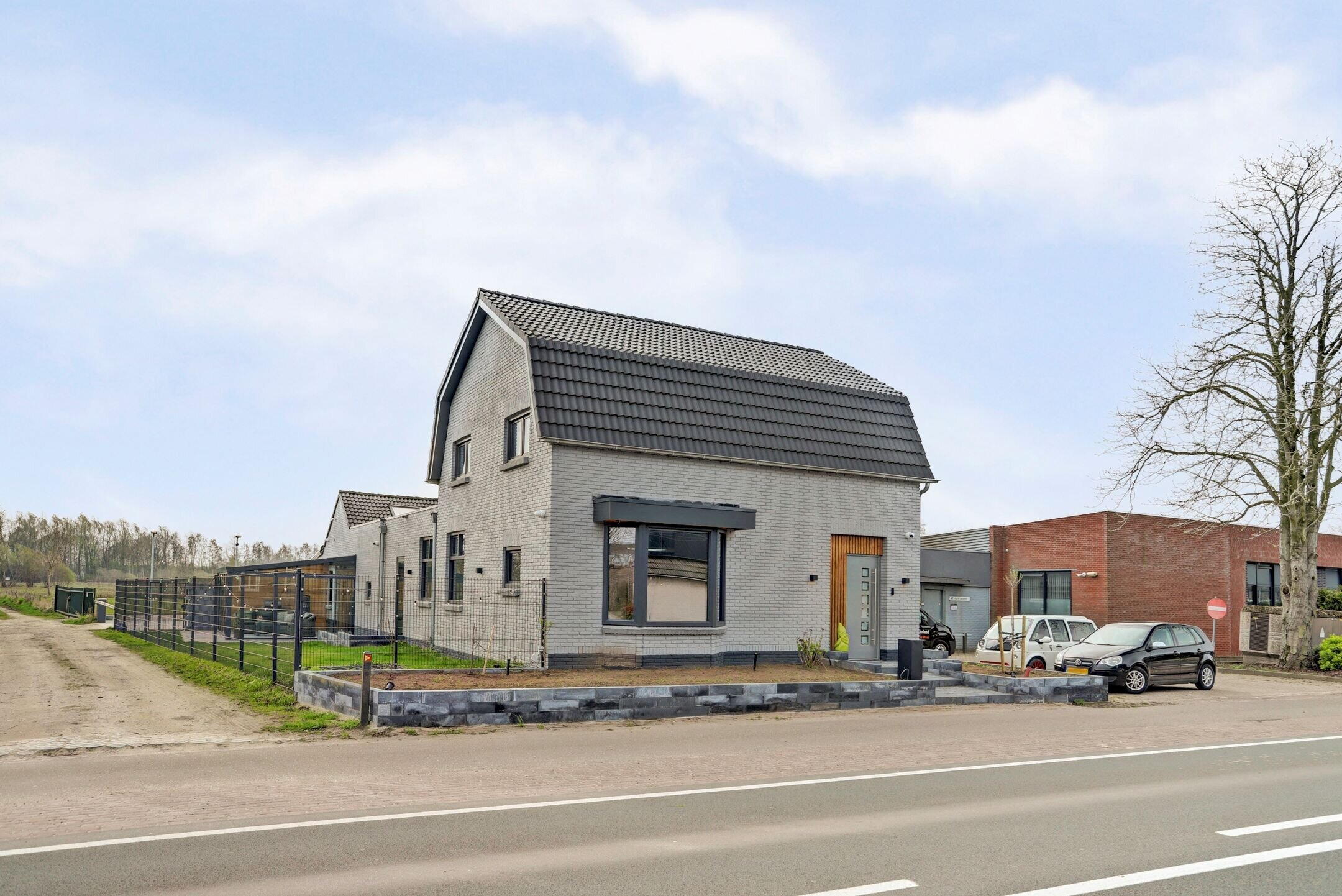 Parkeren doe je hier comfortabel op eigen terrein, netjes afgesloten achter een elektrisch bedienbare slagboom. Via de verhoogde voortuin bereik je via enkele traptredes de nieuwe aluminium voordeur. Nog voordat je binnenstapt valt direct het stijlvolle exterieur op: een gevel in rustige grijstint, gecombineerd met een donker dak, donkere kozijnen en warme houtaccenten bij de entree. Een eigentijdse en verzorgde eerste indruk.