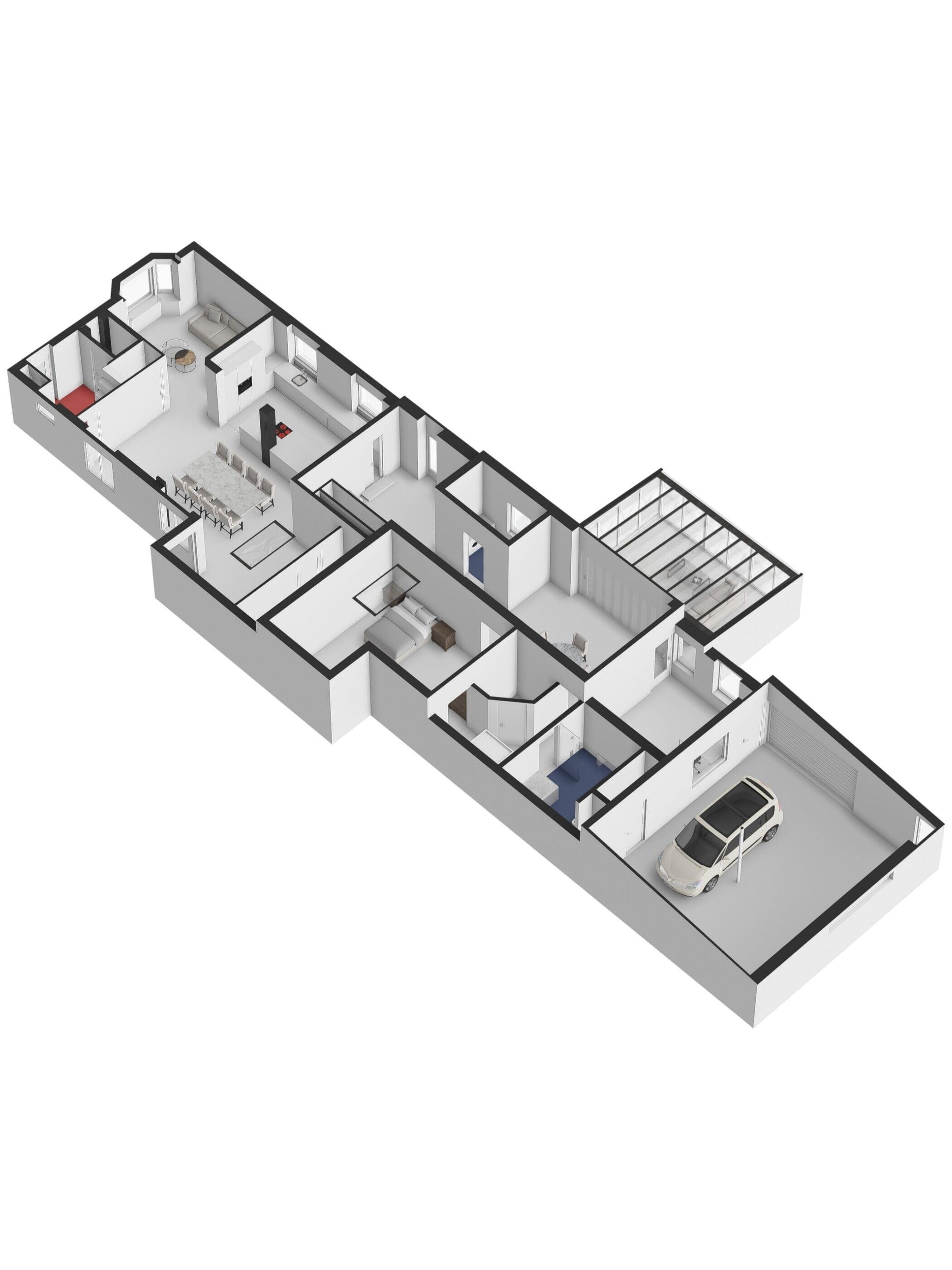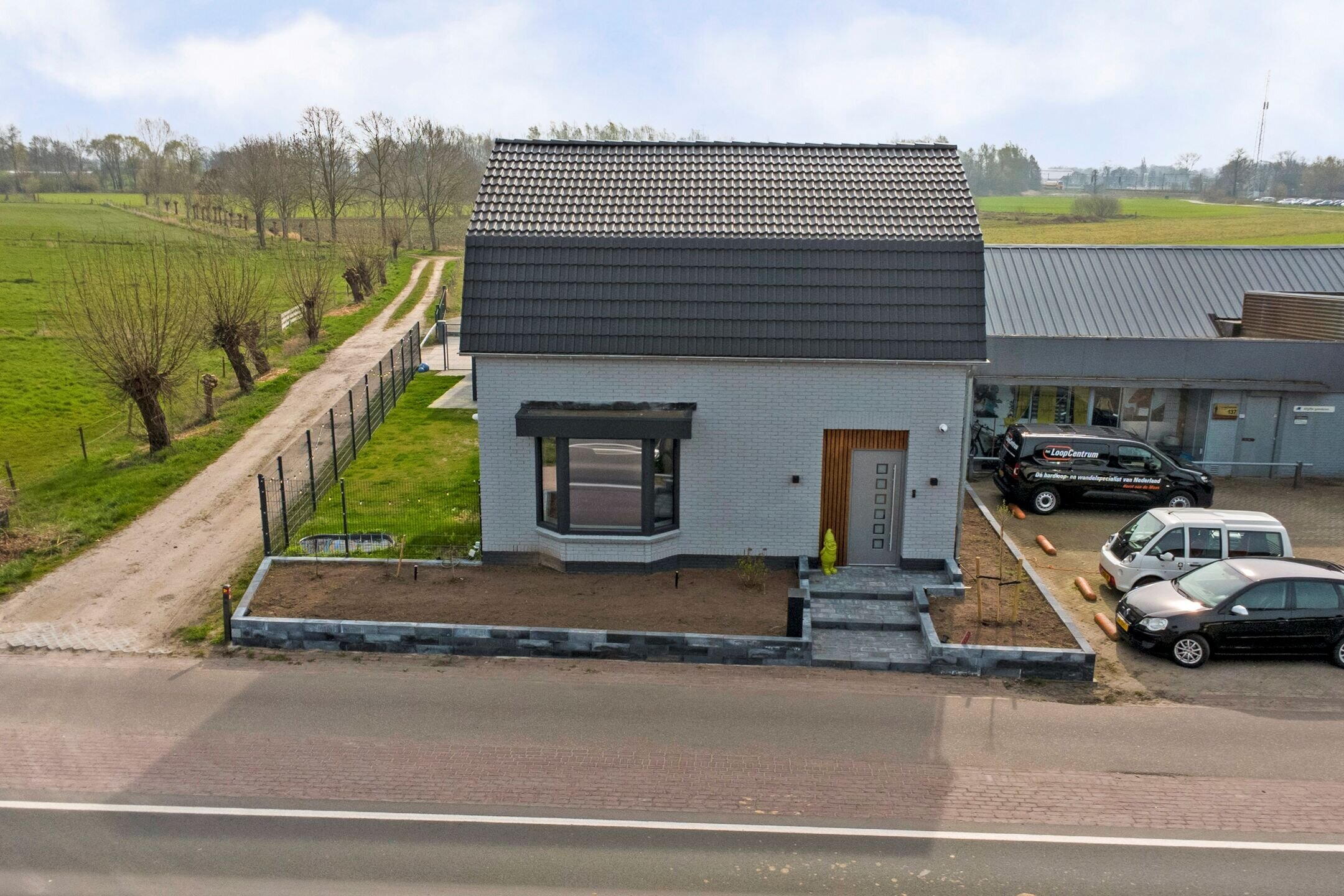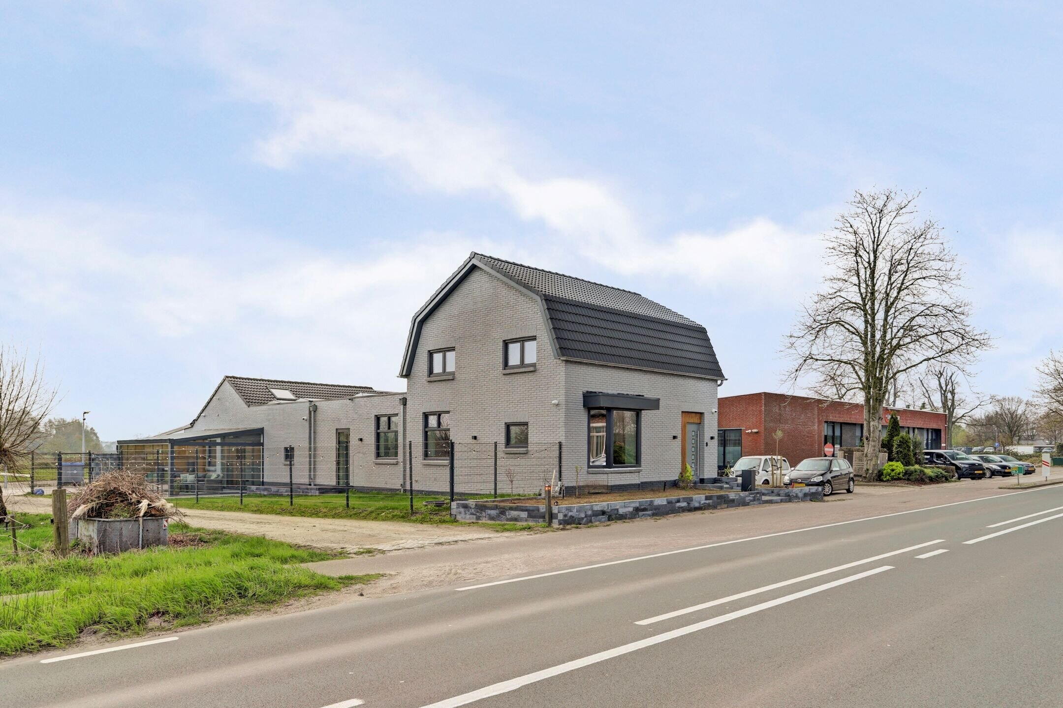Parkeren doe je hier comfortabel op eigen terrein, netjes afgesloten achter een elektrisch bedienbare slagboom. Via de verhoogde voortuin bereik je via enkele traptredes de nieuwe aluminium voordeur. Nog voordat je binnenstapt valt direct het stijlvolle exterieur op: een gevel in rustige grijstint, gecombineerd met een donker dak, donkere kozijnen en warme houtaccenten bij de entree. Een eigentijdse en verzorgde eerste indruk.