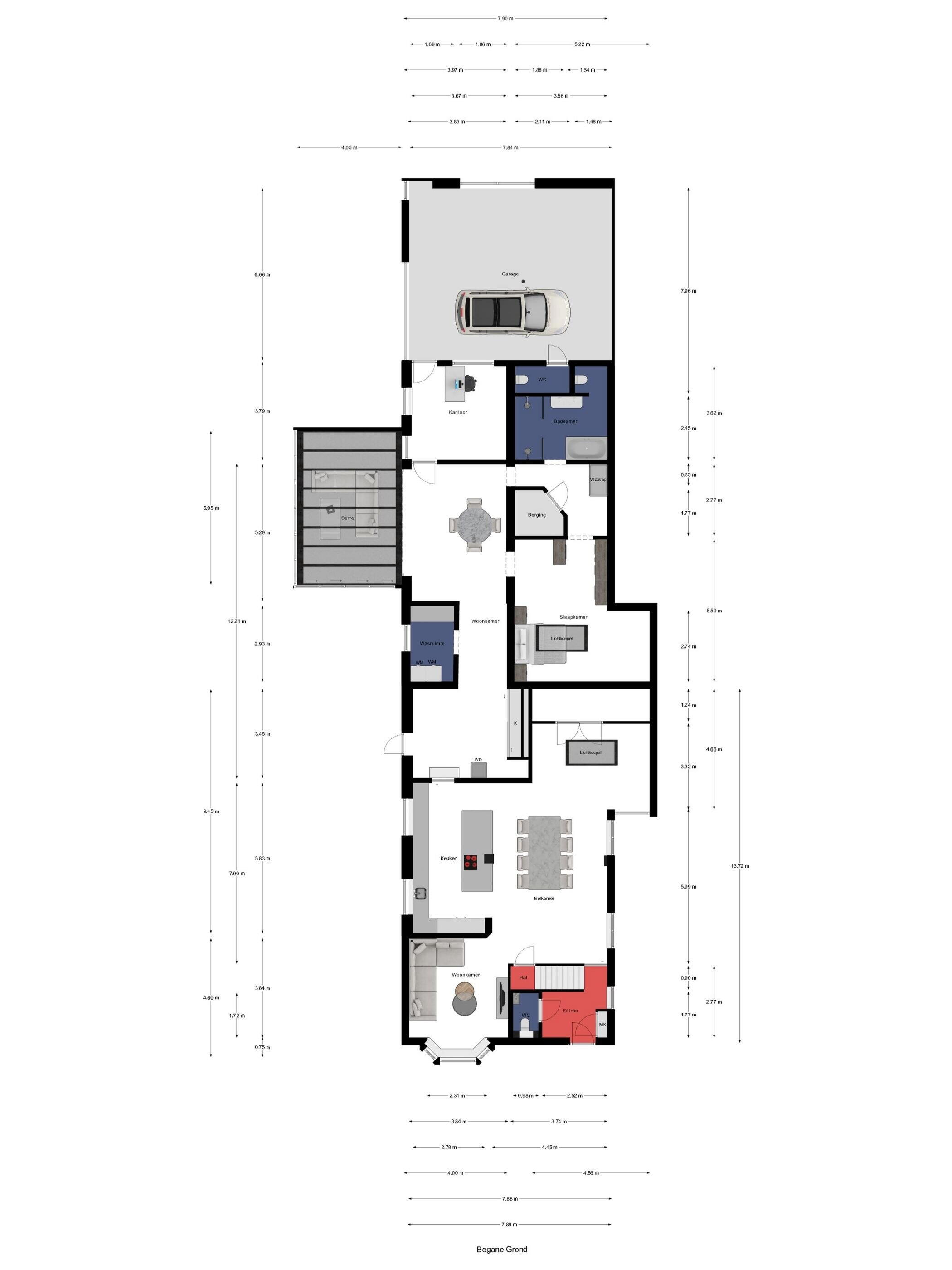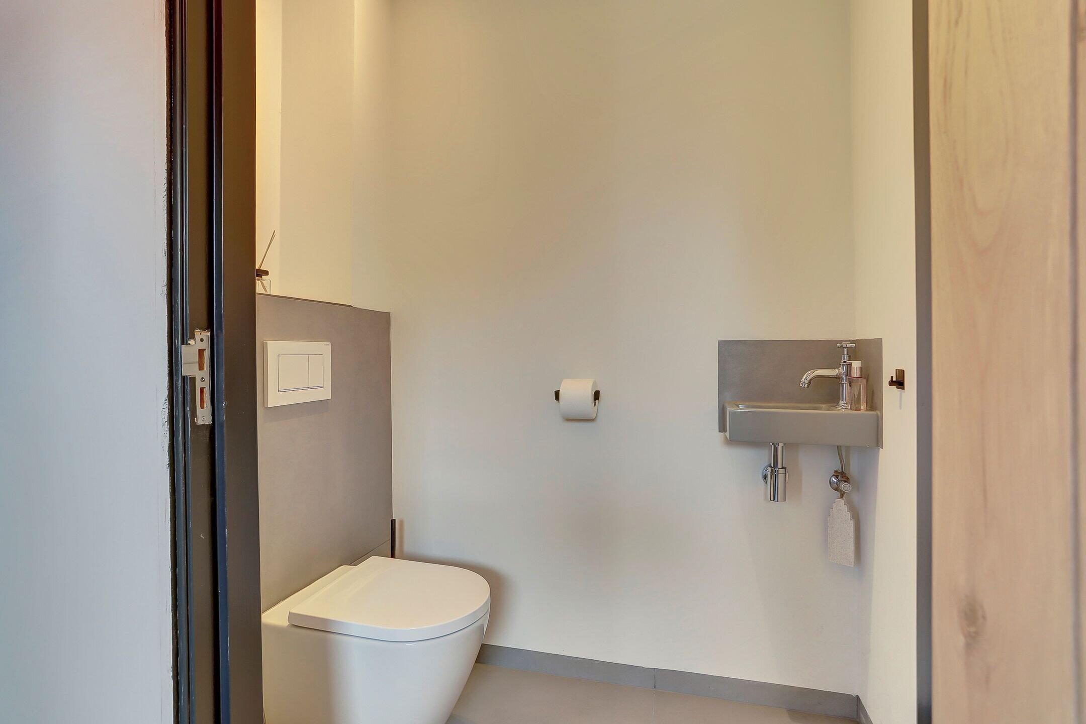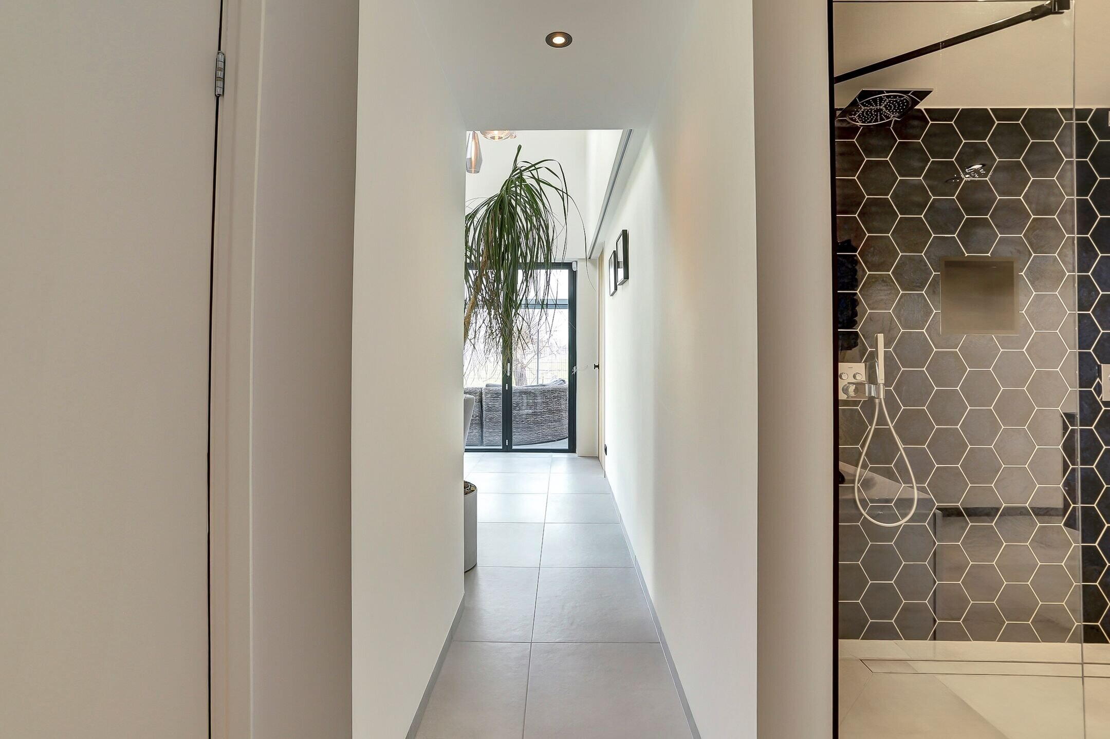 Eenmaal binnen kom je in de hal waar direct de kwaliteit en afwerking voelbaar zijn. Aan de rechterkant bevindt zich de volledig vernieuwde meterkast uitgerust met een modern domoticasysteem en internetaansluiting. Links ligt het toilet, strak afgewerkt met een betegelde achterwand en een praktische nis. De gehele begane grond heeft een lichte tegelvloer van grote tegels met vloerverwarming die overal drempelloos doorlopen.