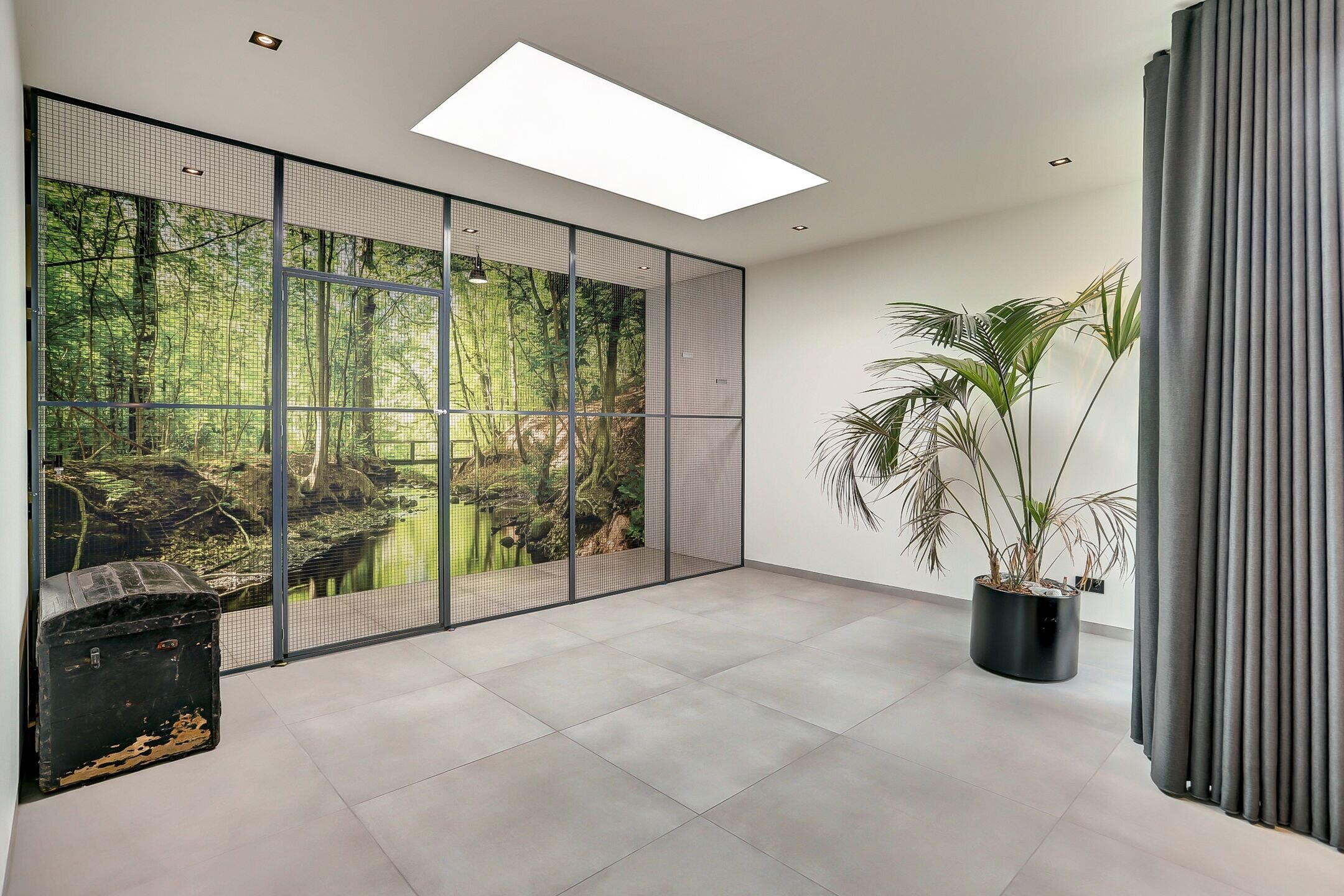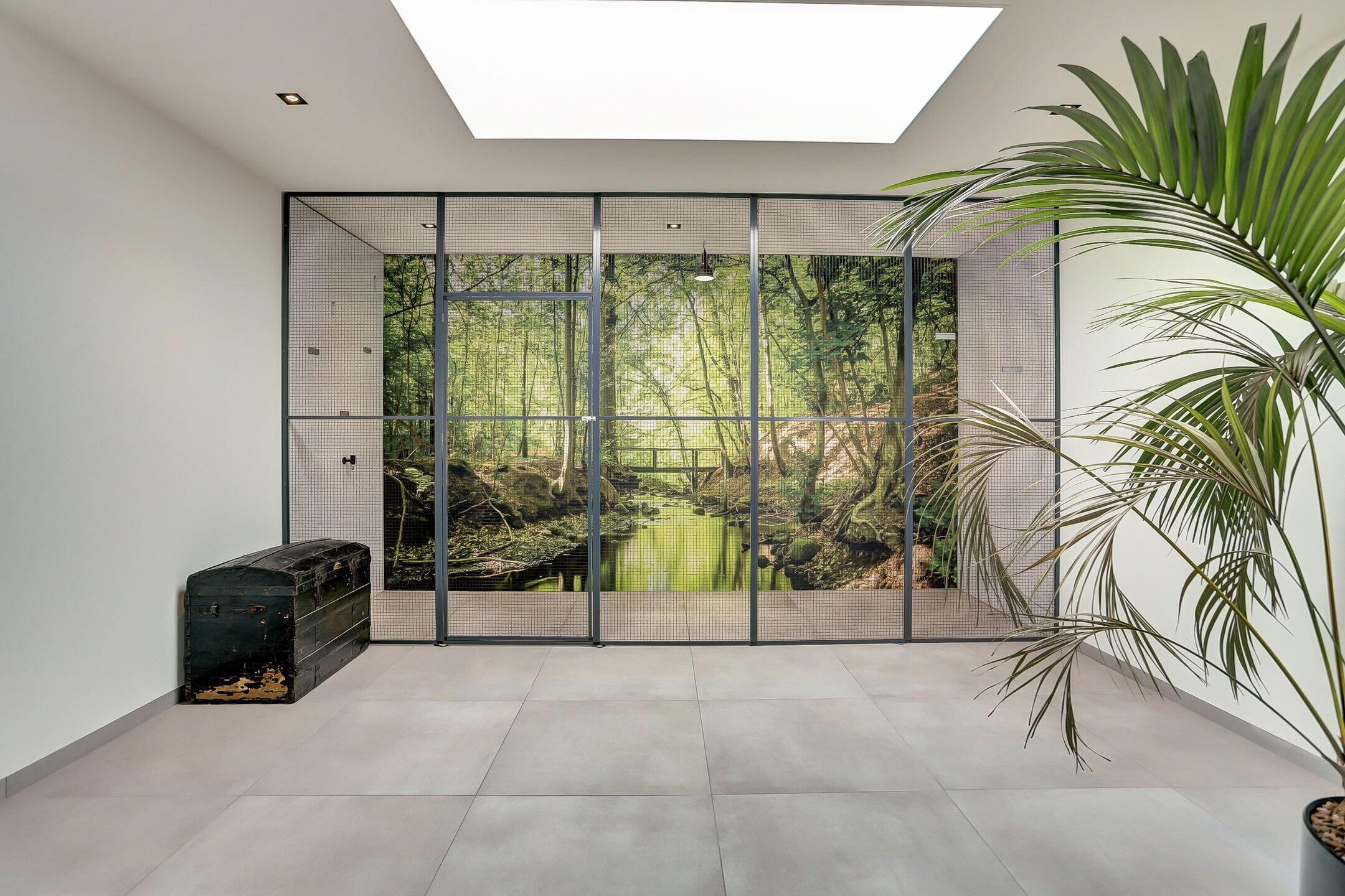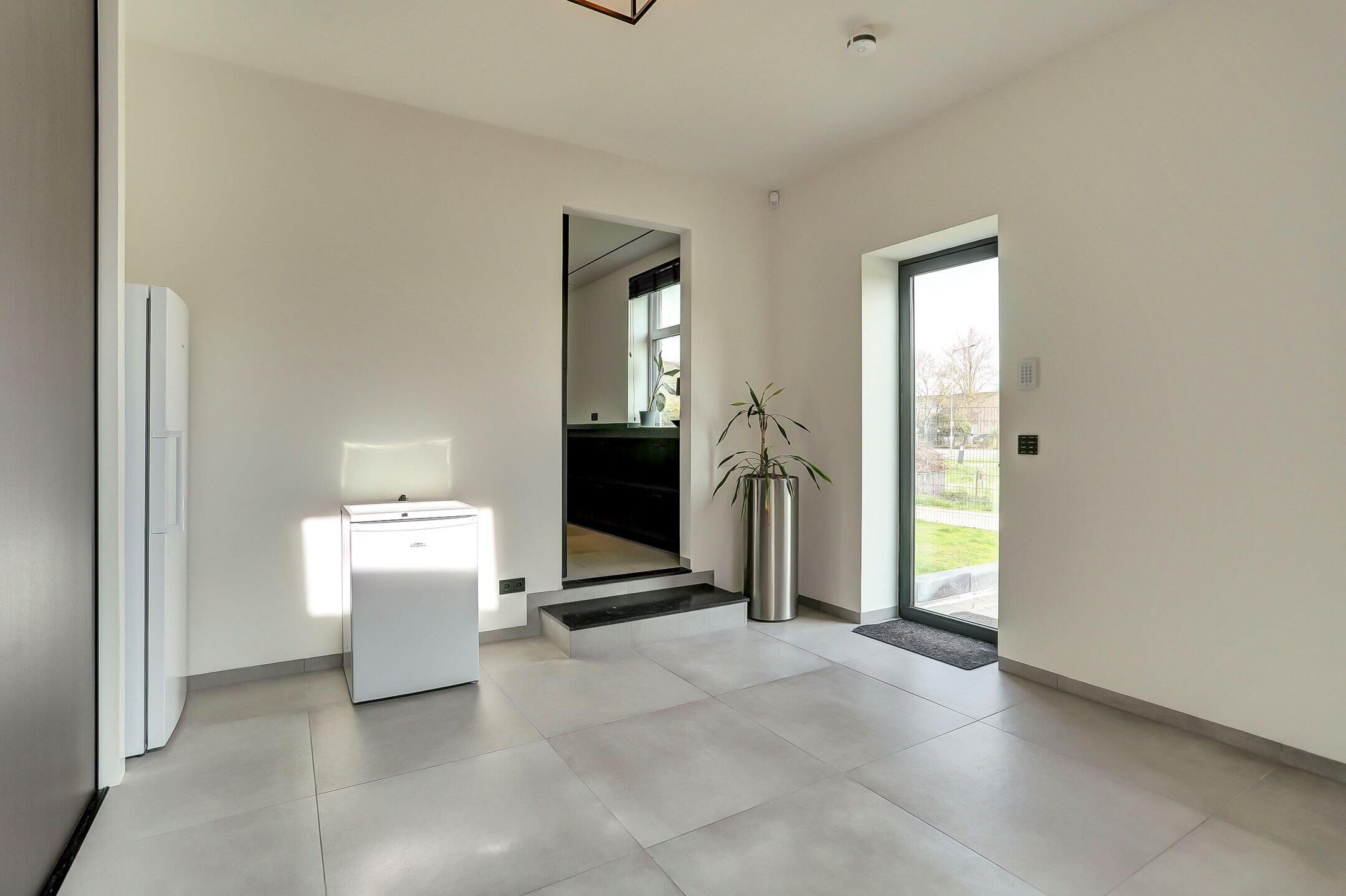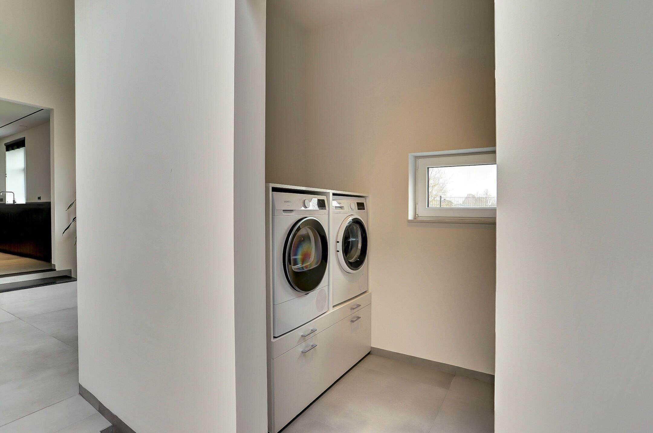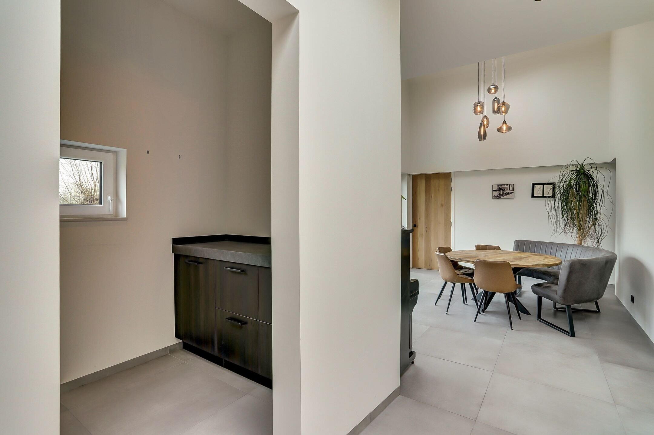 Via een tweede schuifdeur van melkglas bereik je de achterbouw. Een verrassend ruim en veelzijdig gedeelte van de woning dat direct een gevoel van rust en comfort oproept. Je komt binnen in een royale gang waar een praktische inbouwkast is gerealiseerd met daarin onder andere de verdeler van de vloerverwarming. Vanuit hier heb je ook direct toegang tot de tuin. Aan de linkerzijde bevindt zich de verzorgde wasruimte uitgevoerd in dezelfde stijlvolle lijn als de keuken. De kasten met houtmotief zorgen voor eenheid terwijl de op hoogte geplaatste wasmachine en droger het dagelijks gemak vergroten. Verderop ligt een sfeervolle chillruimte. Hier geniet je van het uitzicht op het achterliggende natuurgebied met directe toegang tot het overdekte terras. Binnen en buiten lopen hier moeiteloos in elkaar over.