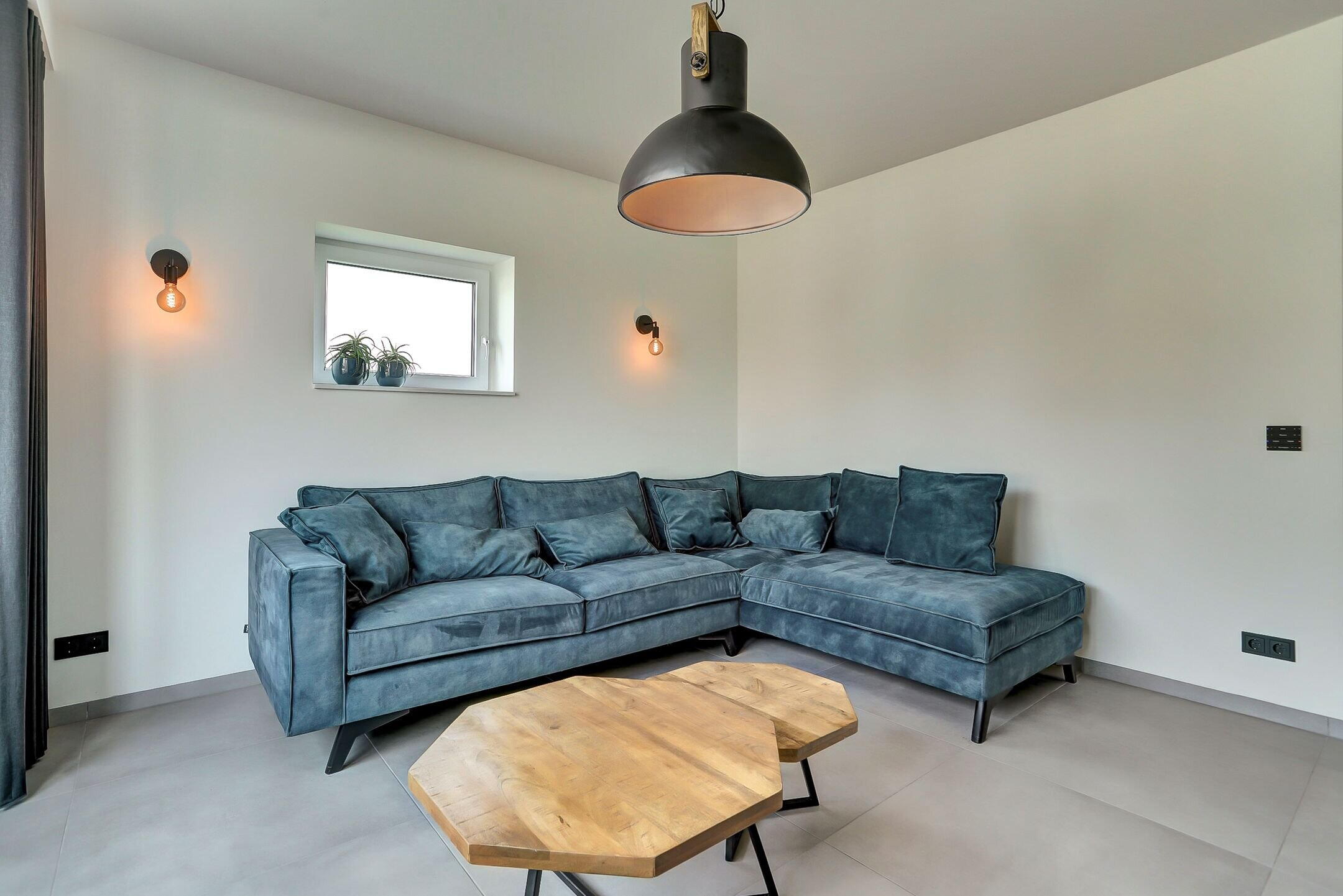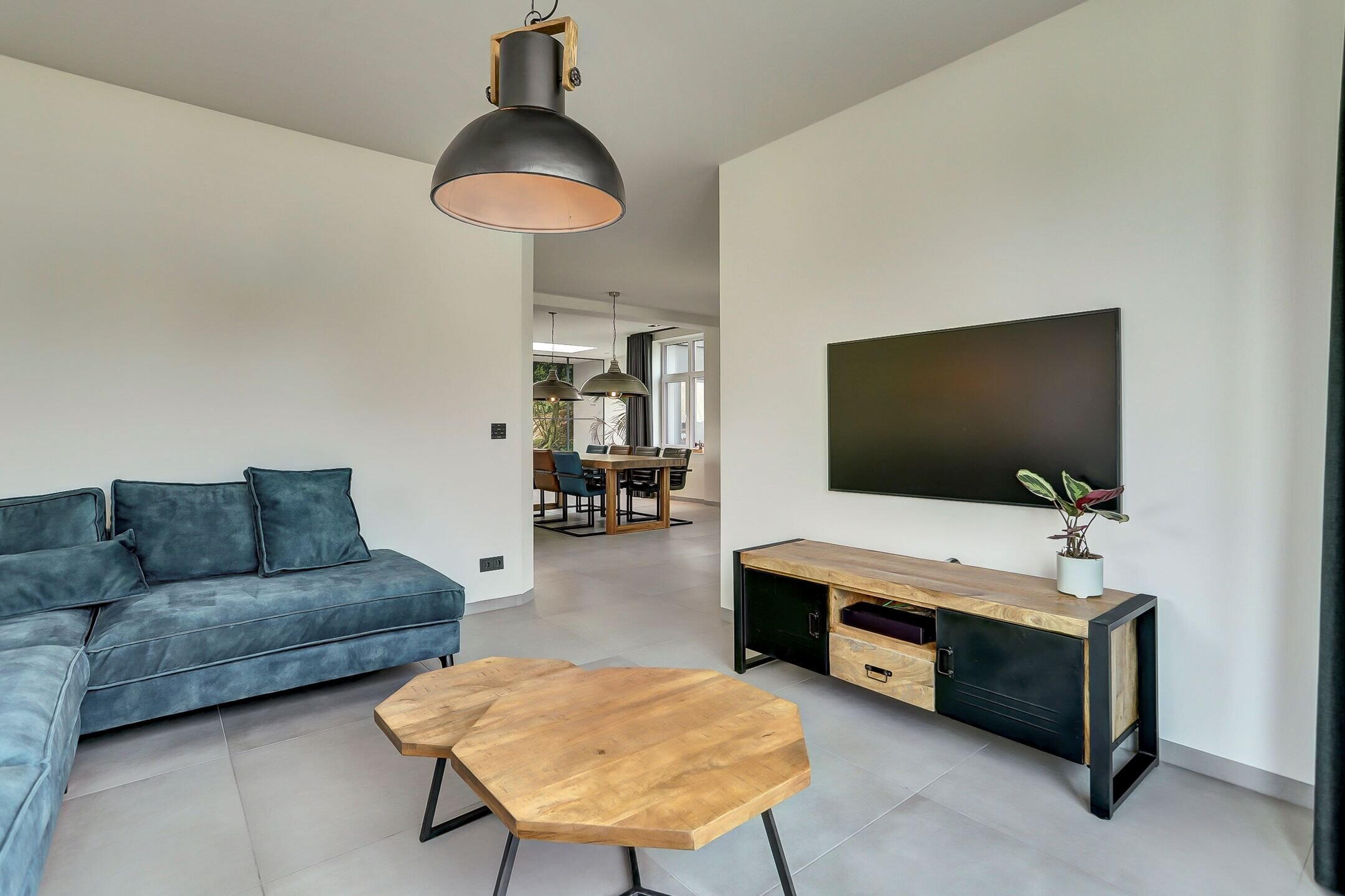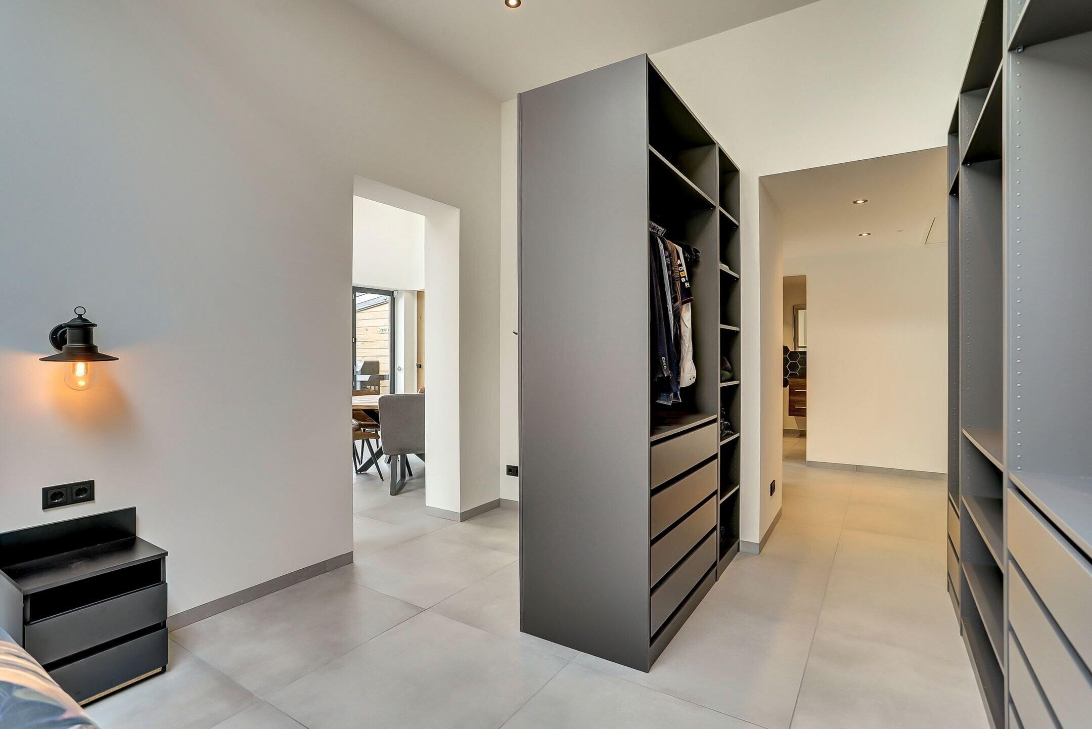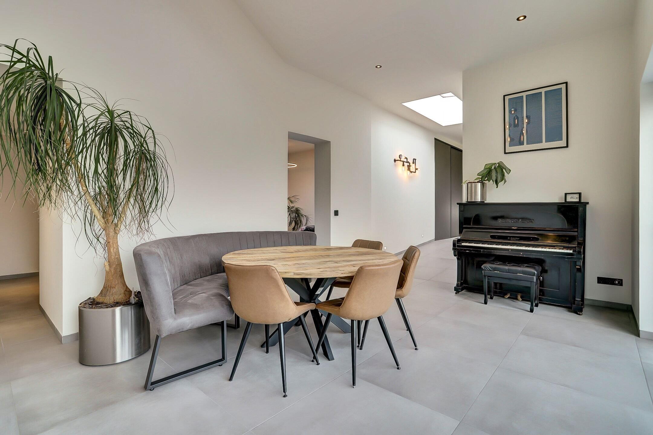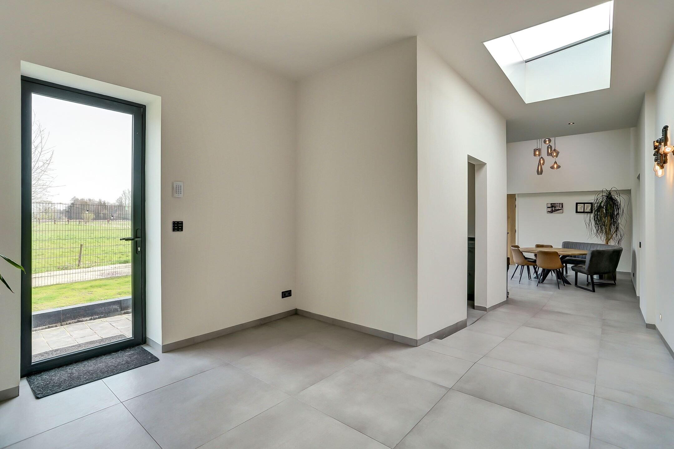Via een tweede schuifdeur van melkglas bereik je de achterbouw. Een verrassend ruim en veelzijdig gedeelte van de woning dat direct een gevoel van rust en comfort oproept. Je komt binnen in een royale gang waar een praktische inbouwkast is gerealiseerd met daarin onder andere de verdeler van de vloerverwarming. Vanuit hier heb je ook direct toegang tot de tuin. Aan de linkerzijde bevindt zich de verzorgde wasruimte uitgevoerd in dezelfde stijlvolle lijn als de keuken. De kasten met houtmotief zorgen voor eenheid terwijl de op hoogte geplaatste wasmachine en droger het dagelijks gemak vergroten. Verderop ligt een sfeervolle chillruimte. Hier geniet je van het uitzicht op het achterliggende natuurgebied met directe toegang tot het overdekte terras. Binnen en buiten lopen hier moeiteloos in elkaar over.