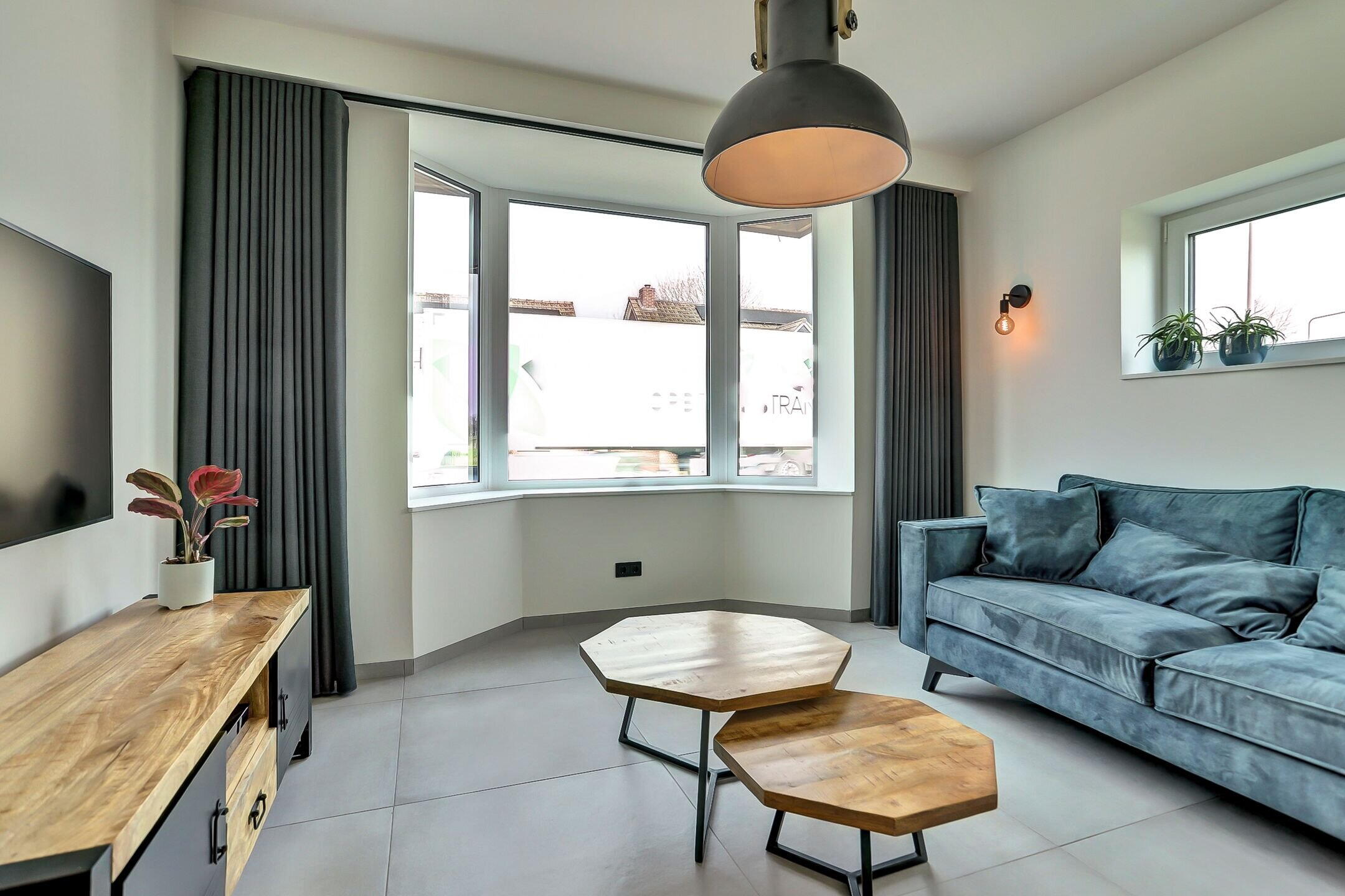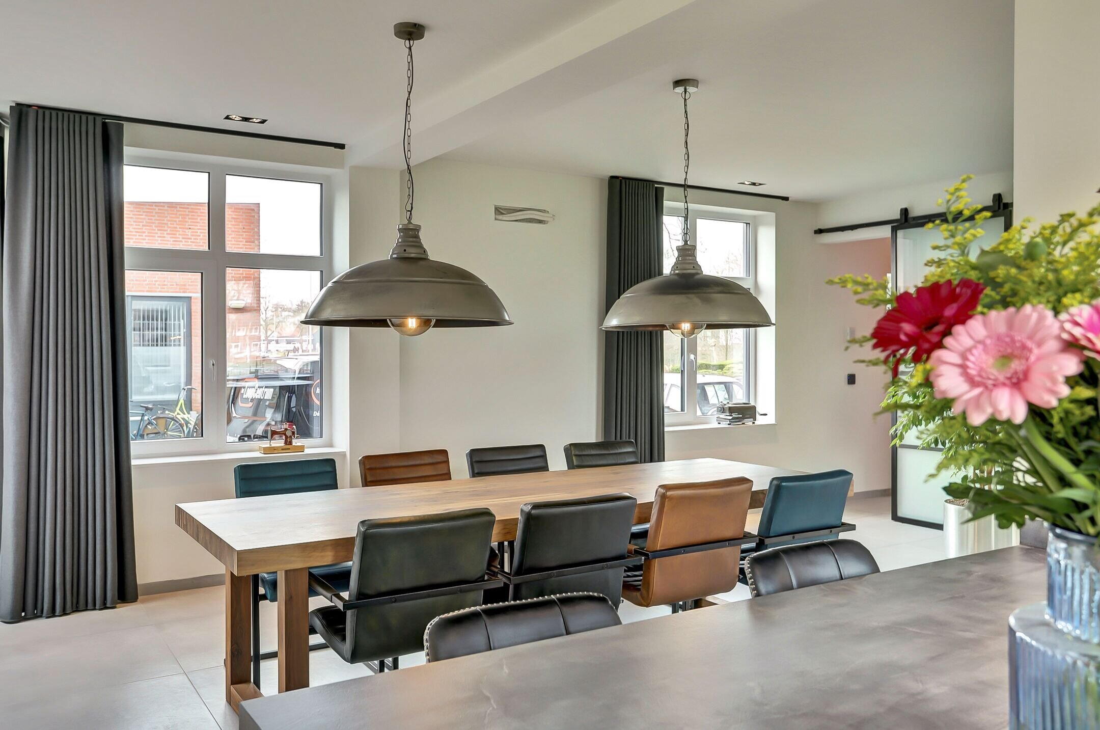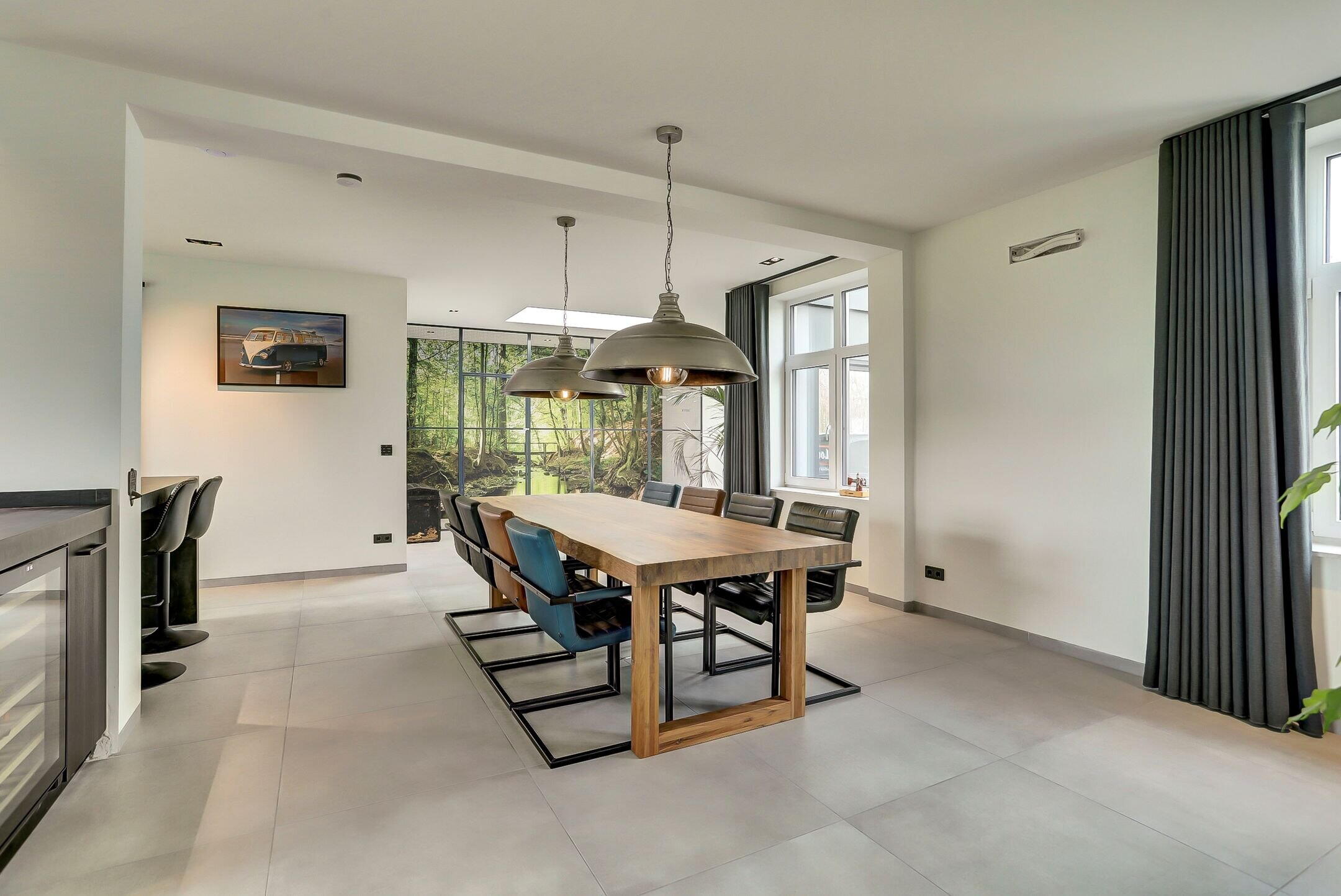 De woonkamer ligt aan de voorzijde en staat in directe verbinding met de keuken. Hier zorgt de grote erker, samen met het zijraam, voor een prachtige lichtinval en een ruimtelijk gevoel. De elektrisch bedienbare gordijnen in de erker voegen een extra vleugje comfort en luxe toe.