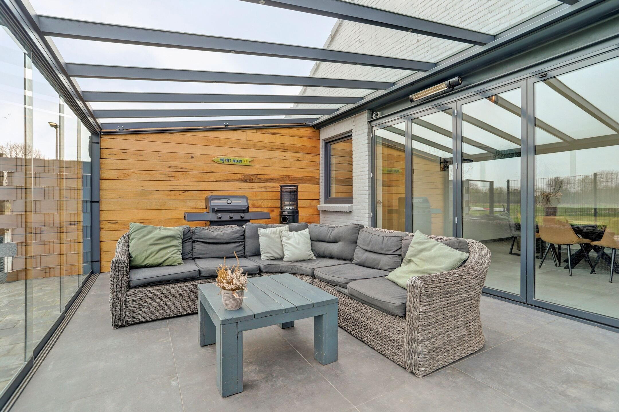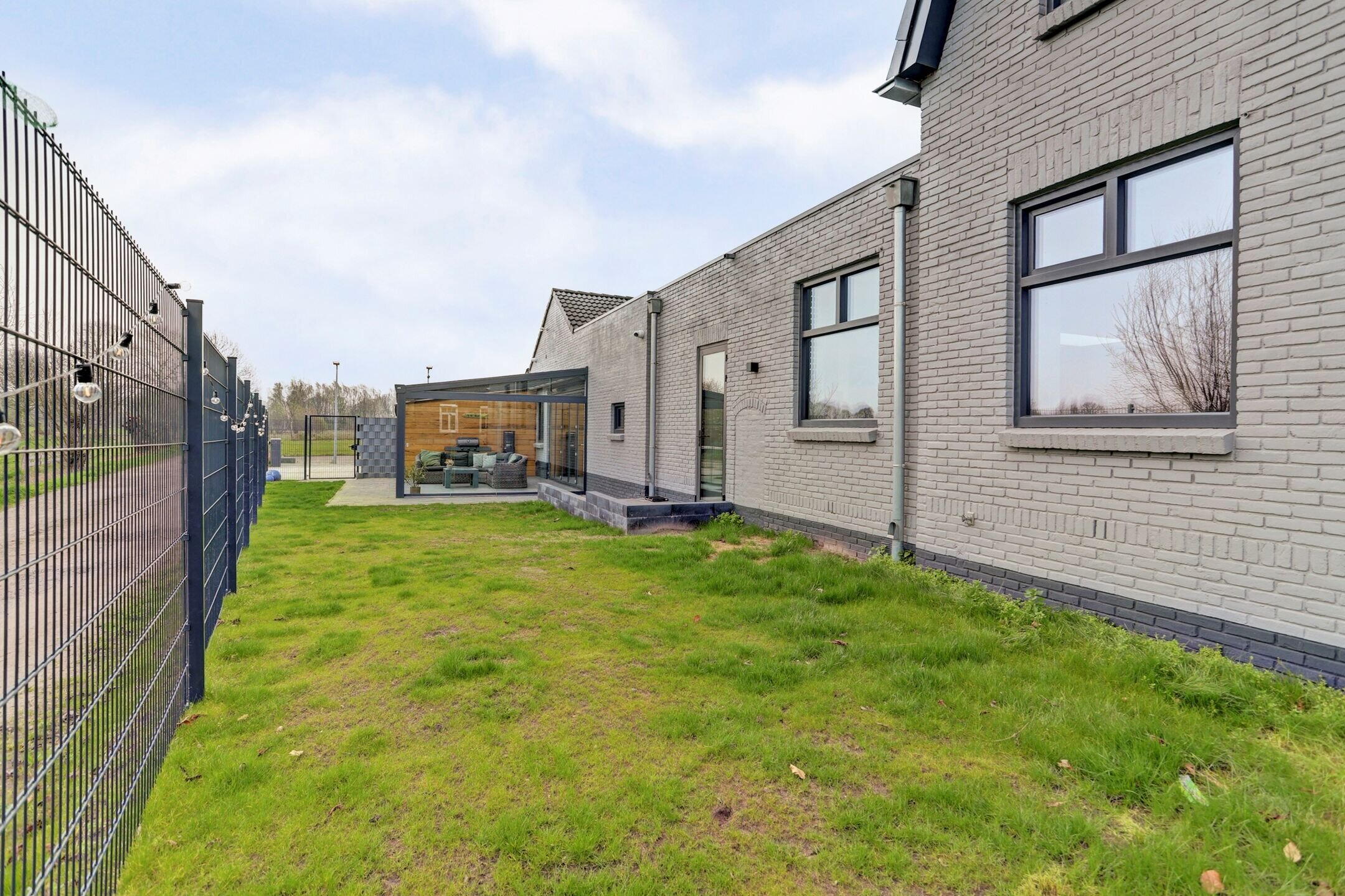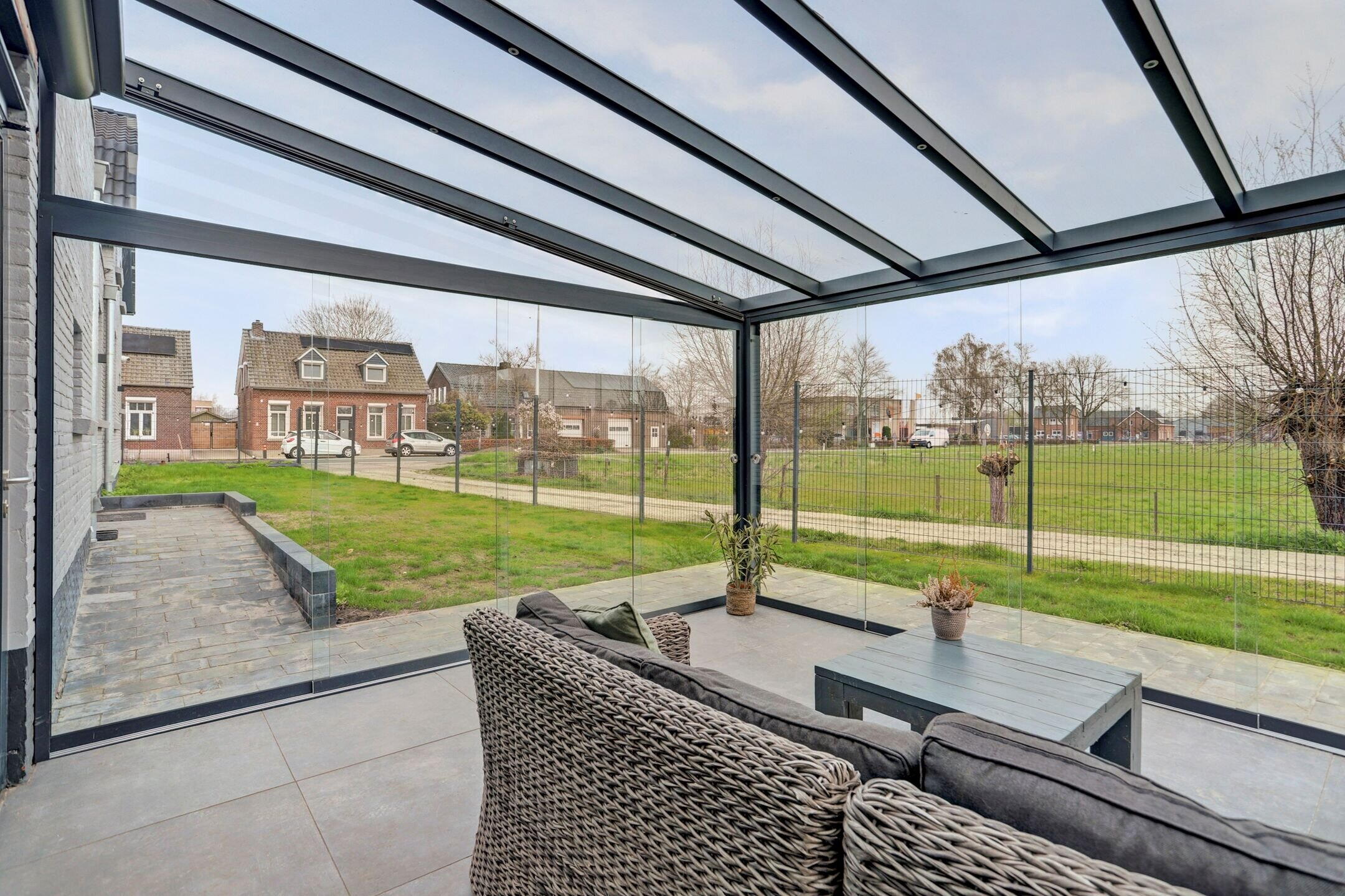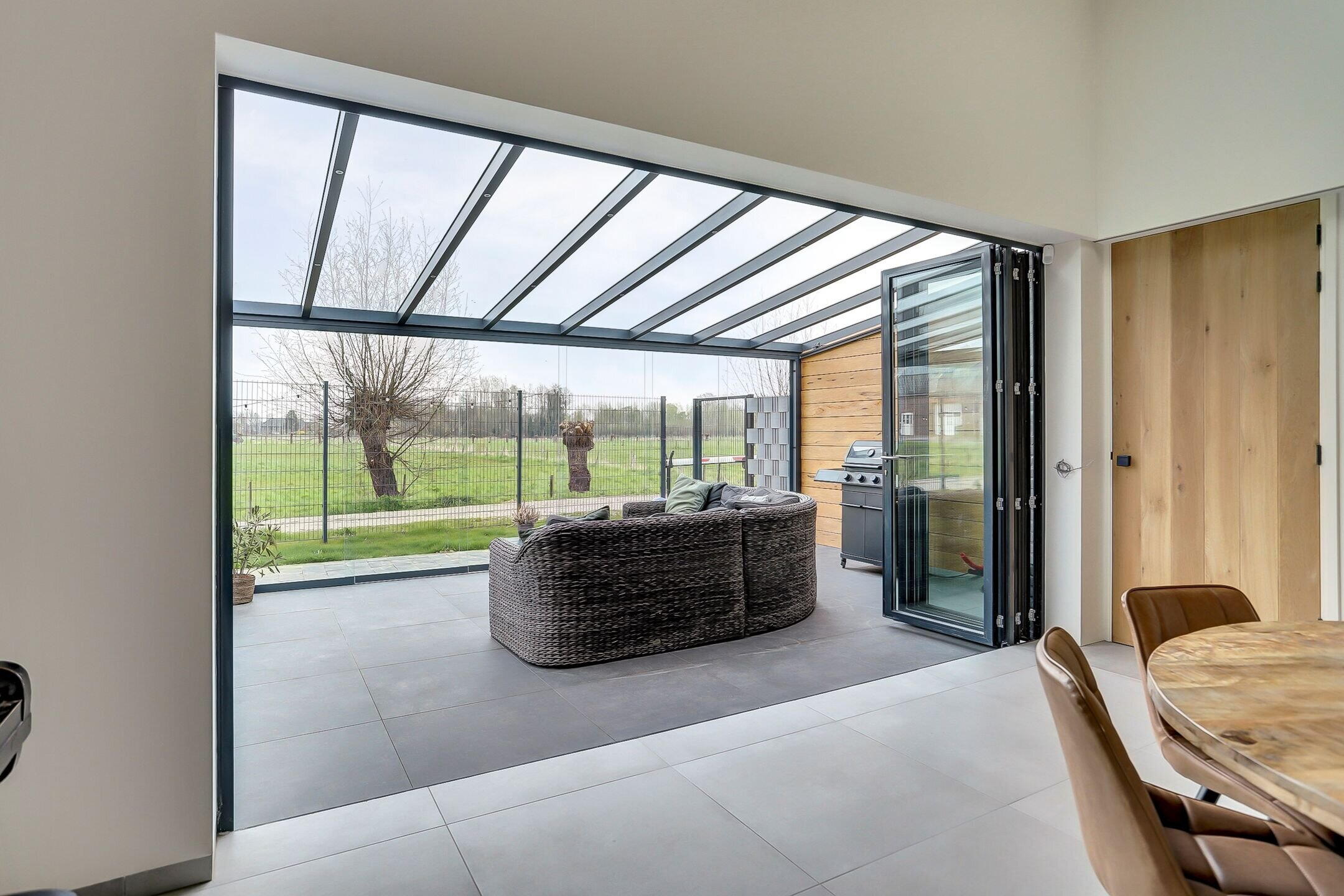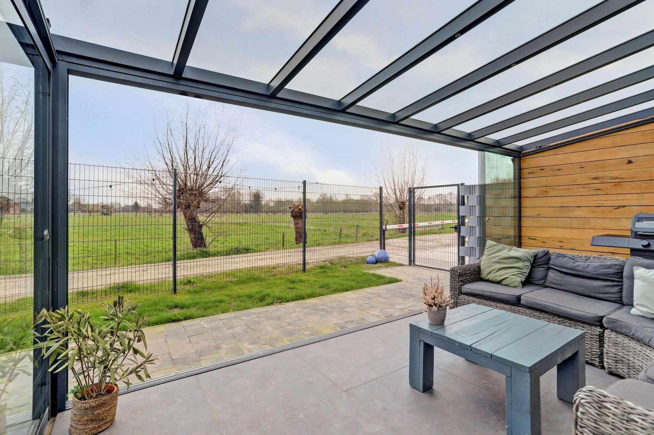 Centraal in de tuin ligt het royale overdekte terras, een plek waar binnen en buiten naadloos samenkomen. Dankzij de glazen schuifpanelen kun je het terras volledig openen terwijl de harmonicadeuren richting de woning ervoor zorgen dat je op mooie dagen één grote leefruimte creëert. Het is de ideale setting voor lange zomeravonden maar ook op koelere dagen zit je hier beschut en comfortabel. Het glazen dak is voorzien van zonwering en geïntegreerde verlichting waardoor je hier in alle seizoenen en op elk moment van de dag prettig kunt verblijven. Bovendien zijn er al aansluitingen aanwezig voor een buitenkeuken, een uitnodiging om deze plek nóg verder te verrijken en volledig naar eigen wens in te richten. De tuin zelf is overzichtelijk aangelegd met een groen gazon en omheind met een hekwerk wat zorgt voor een fijne balans tussen openheid en privacy. Om de tuin mooi groen te kunnen houden is er al een voorbereiding getroffen voor een beregeningsinstallatie.