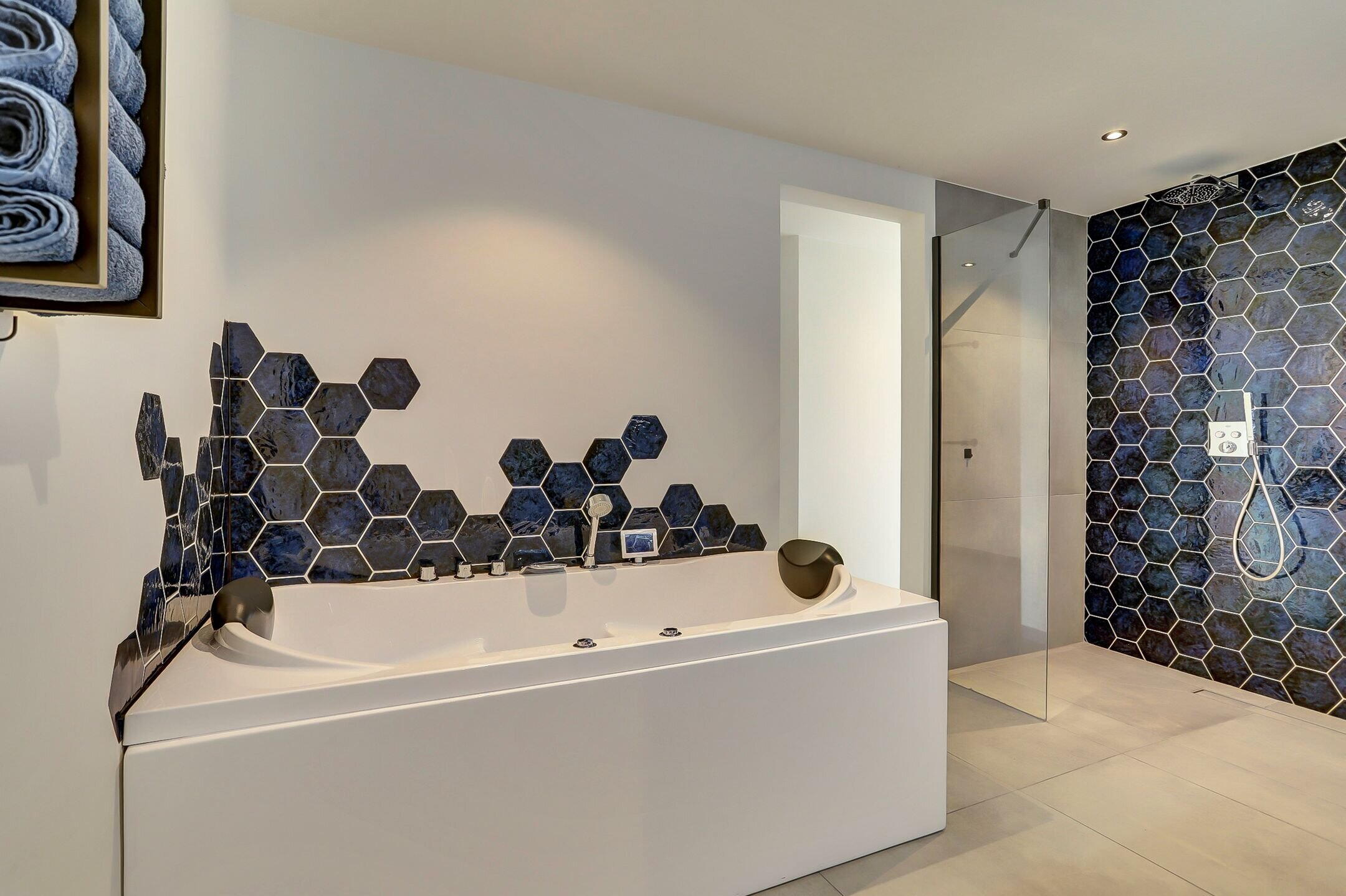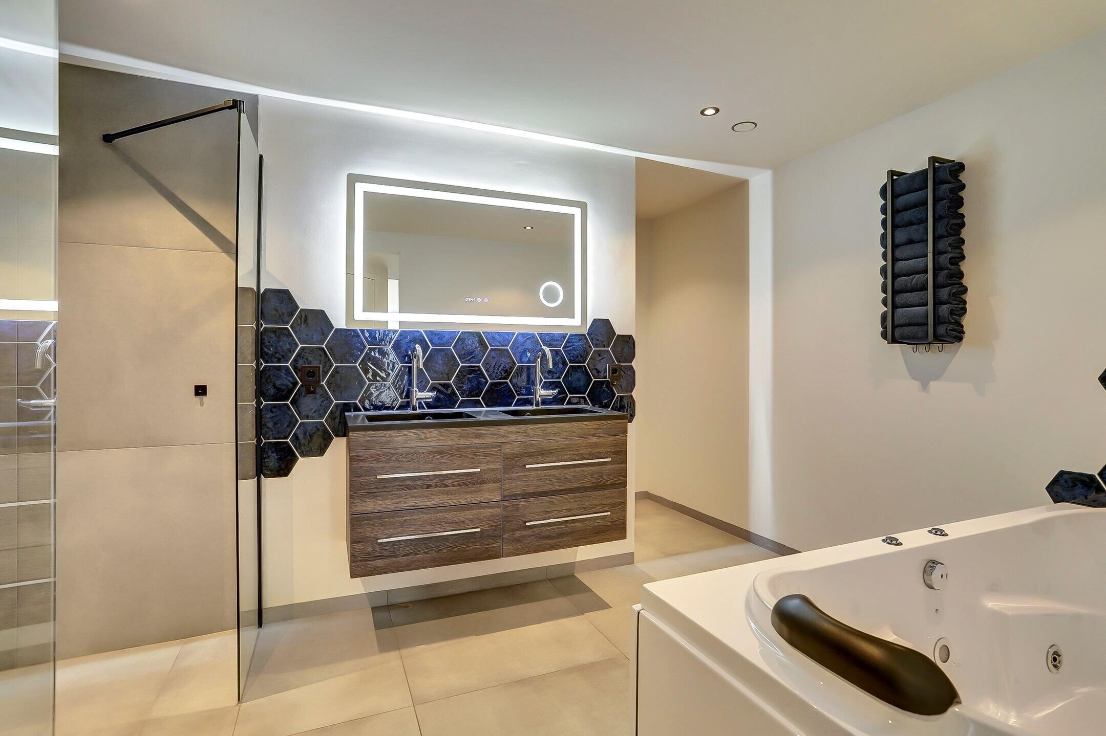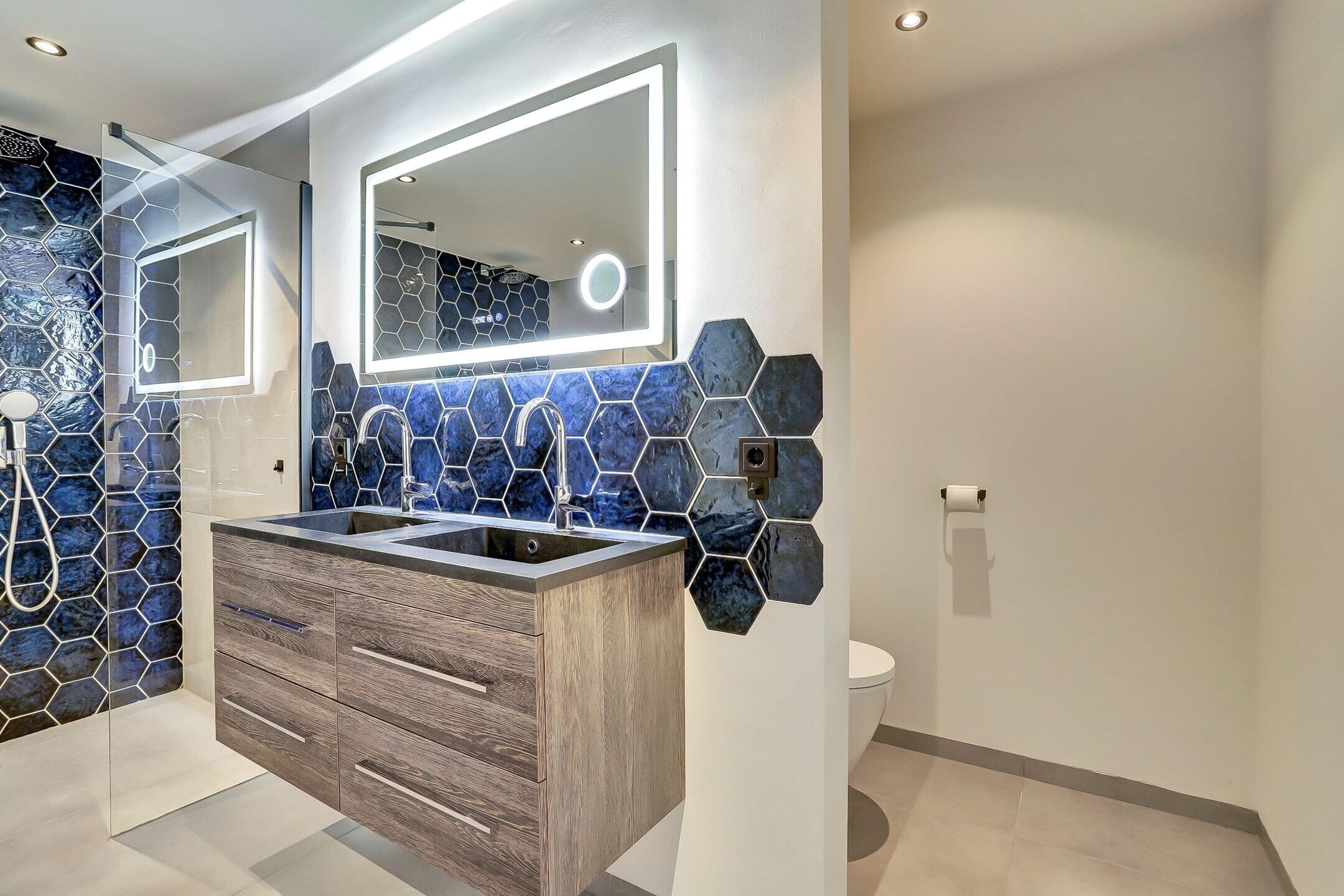 De ensuite badkamer is ruim opgezet en luxe uitgevoerd. Hier kom je volledig tot rust in het bubbelbad of onder één van de twee douches, beide voorzien van een regendouche en handdouche. De dubbele wastafel met vier royale opberglades en een hoogwaardige anticondens spiegel met verwarming, verlichting en geïntegreerde vergrootspiegel maken het geheel compleet. Het toilet is subtiel uit het zicht geplaatst achter een wandje om de hoek. De afwerking van de badkamer is stijlvol en rustgevend met een bijzonder accent: een wand van donkerblauwe hexagontegels in de douche die subtiel terugkomt achter het bad en het geheel een luxe uitstraling geeft.