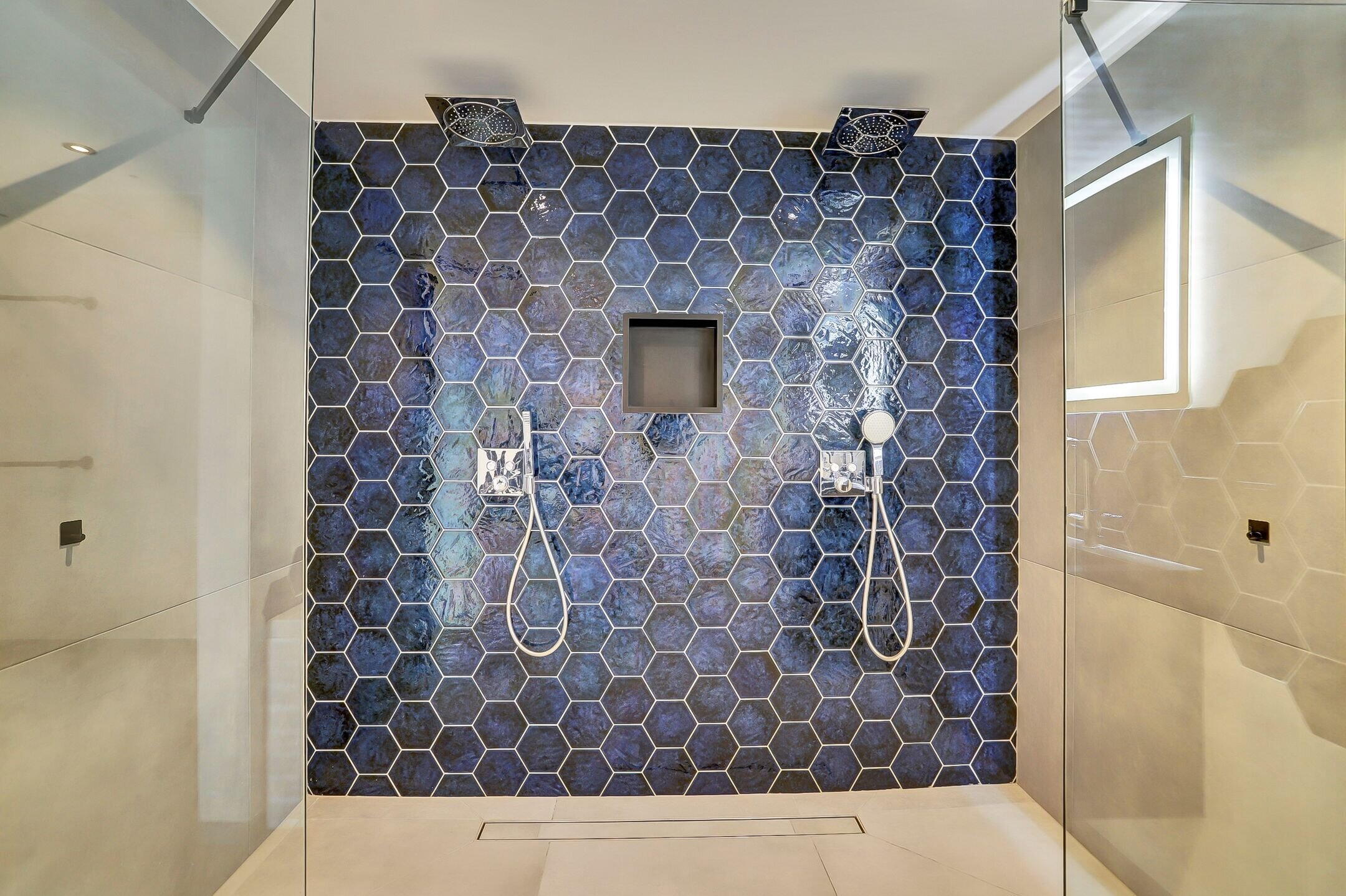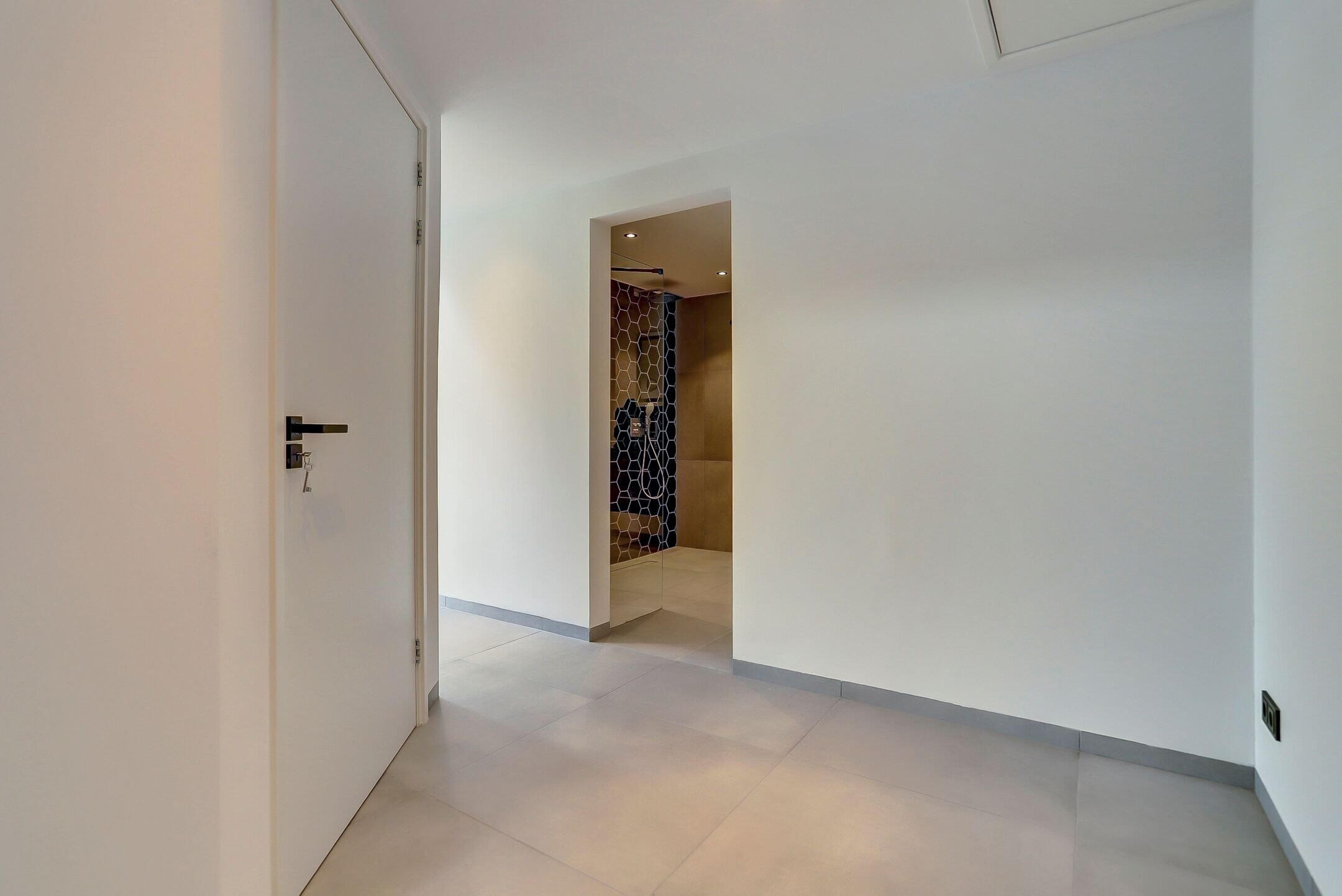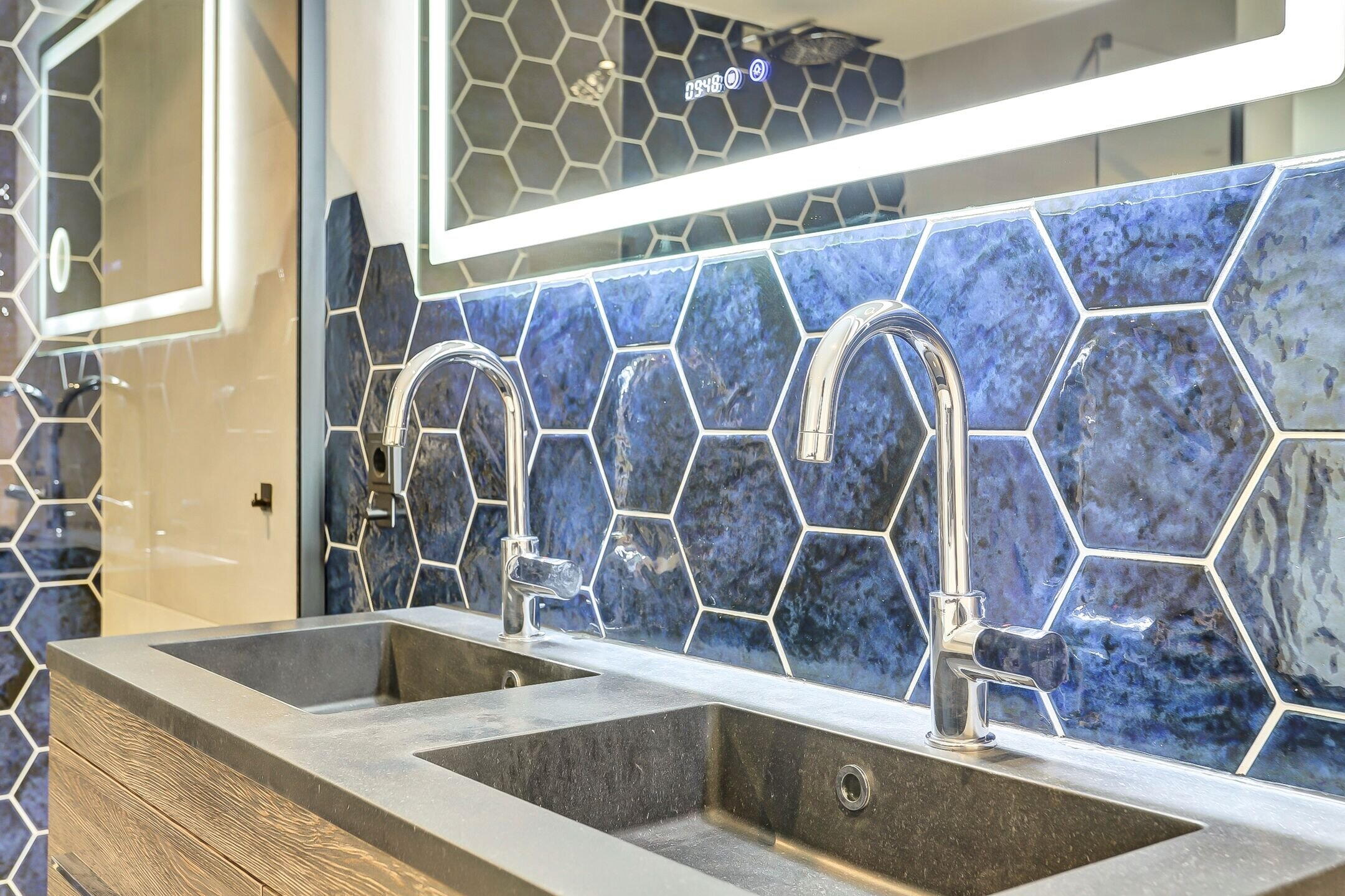 De ensuite badkamer is ruim opgezet en luxe uitgevoerd. Hier kom je volledig tot rust in het bubbelbad of onder één van de twee douches, beide voorzien van een regendouche en handdouche. De dubbele wastafel met vier royale opberglades en een hoogwaardige anticondens spiegel met verwarming, verlichting en geïntegreerde vergrootspiegel maken het geheel compleet. Het toilet is subtiel uit het zicht geplaatst achter een wandje om de hoek. De afwerking van de badkamer is stijlvol en rustgevend met een bijzonder accent: een wand van donkerblauwe hexagontegels in de douche die subtiel terugkomt achter het bad en het geheel een luxe uitstraling geeft.