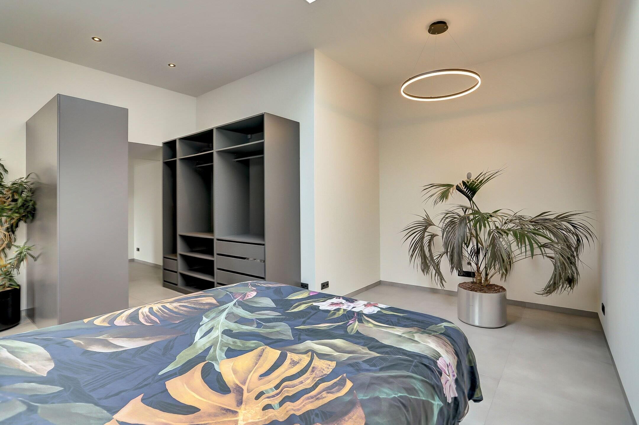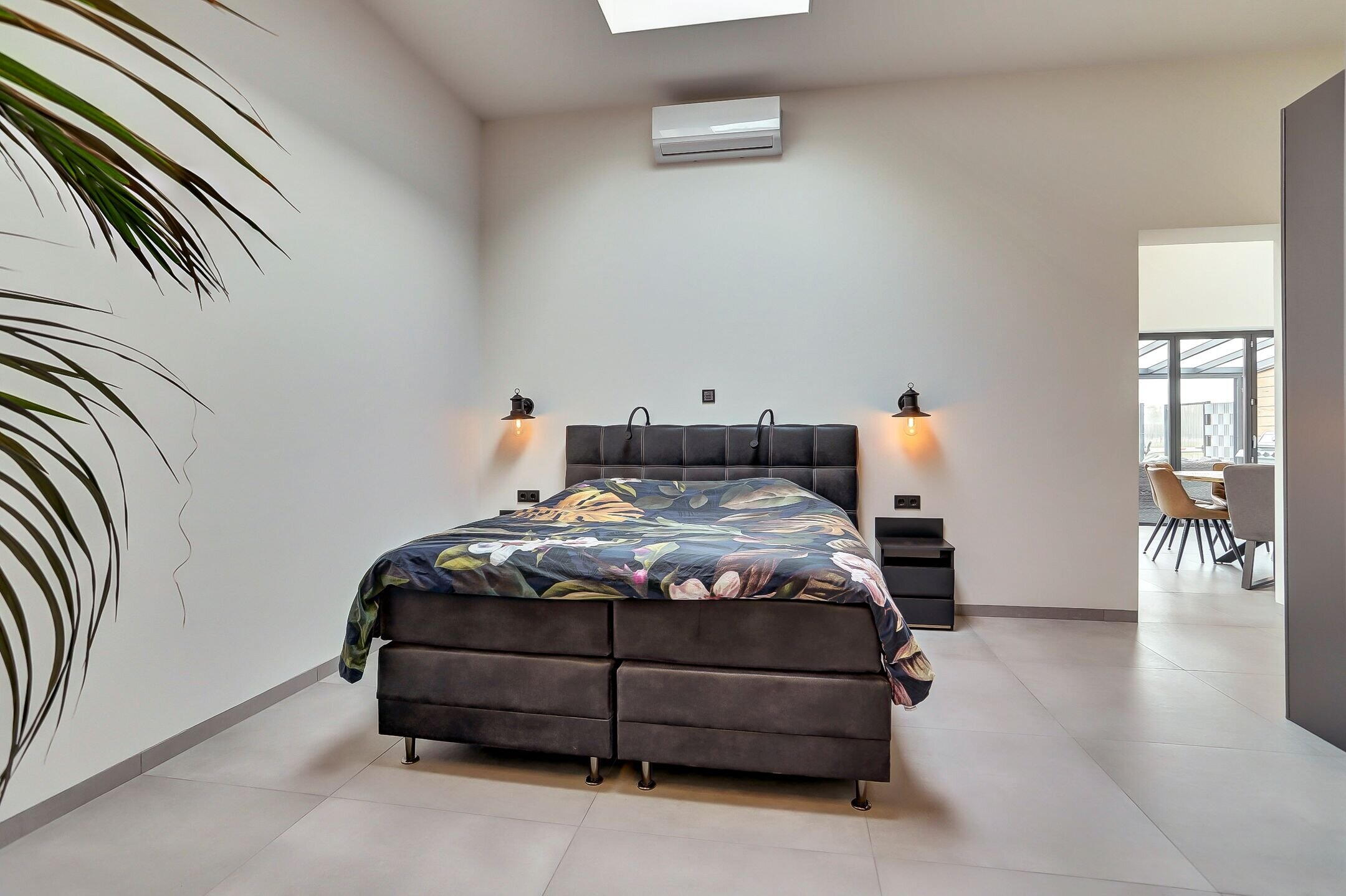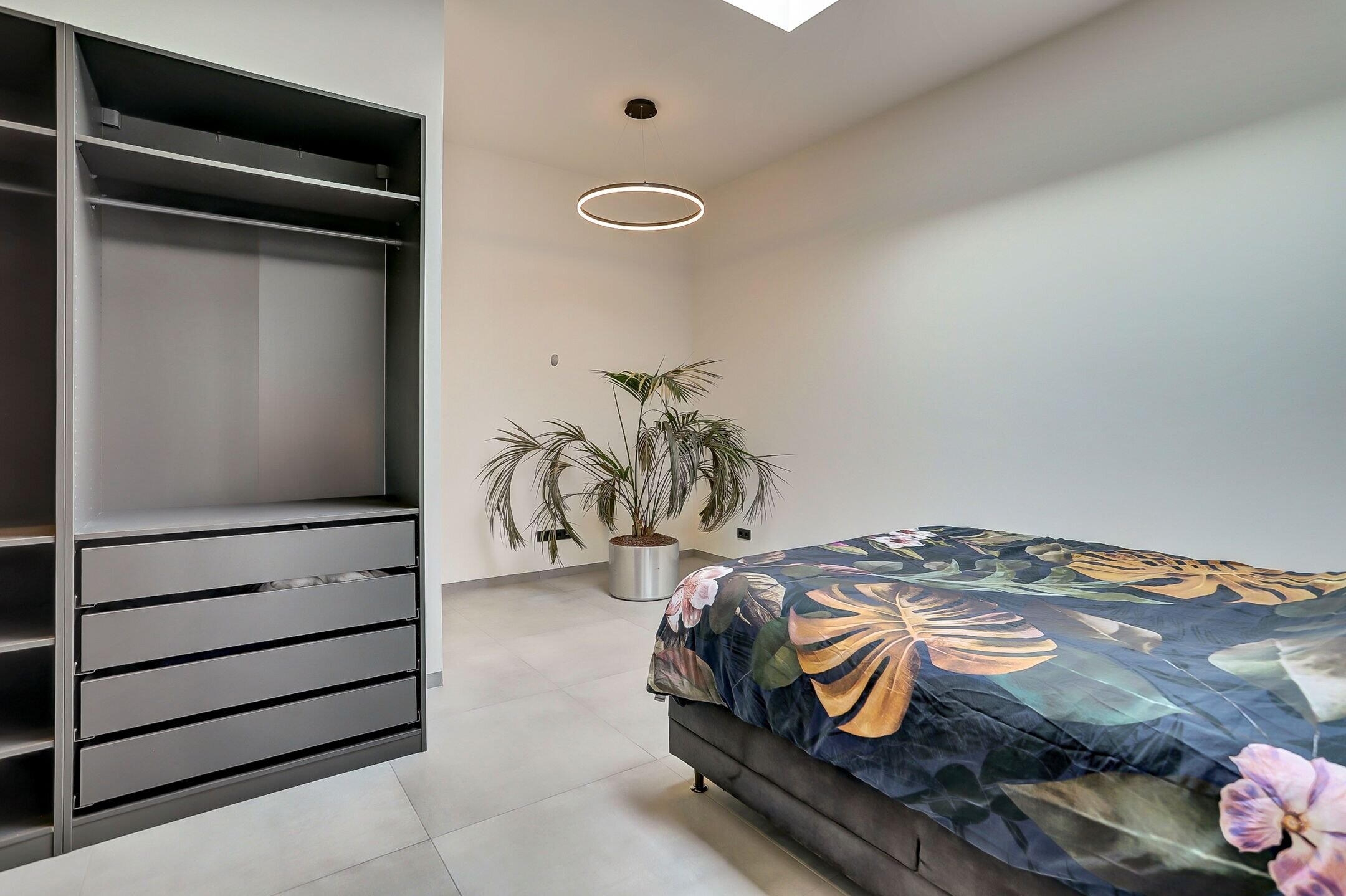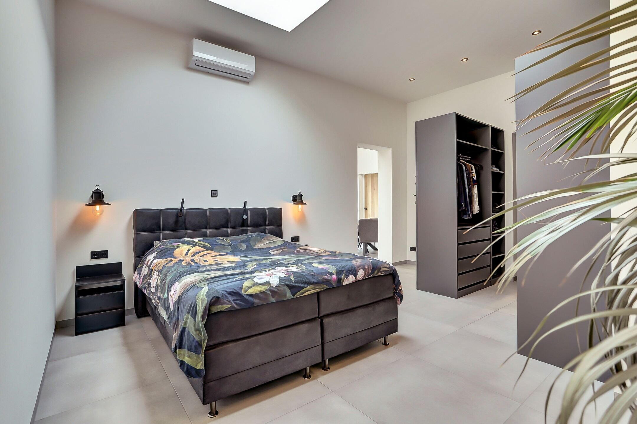 Aan de rechterzijde bevindt zich een comfortabele slaapkamer met inloopkast en een ensuite badkamer. Ondanks het ontbreken van traditionele ramen voelt deze ruimte opvallend licht en open dankzij de grote lichtstraat in het plafond. Overdag zorgt deze voor een aangename lichtinval terwijl je ’s avonds zelfs een blik op de sterren kunt werpen. Voor extra comfort is de lichtstraat volledig te verduisteren met een elektrisch bedienbaar gordijn. In deze kamer is een airco-installatie aanwezig.